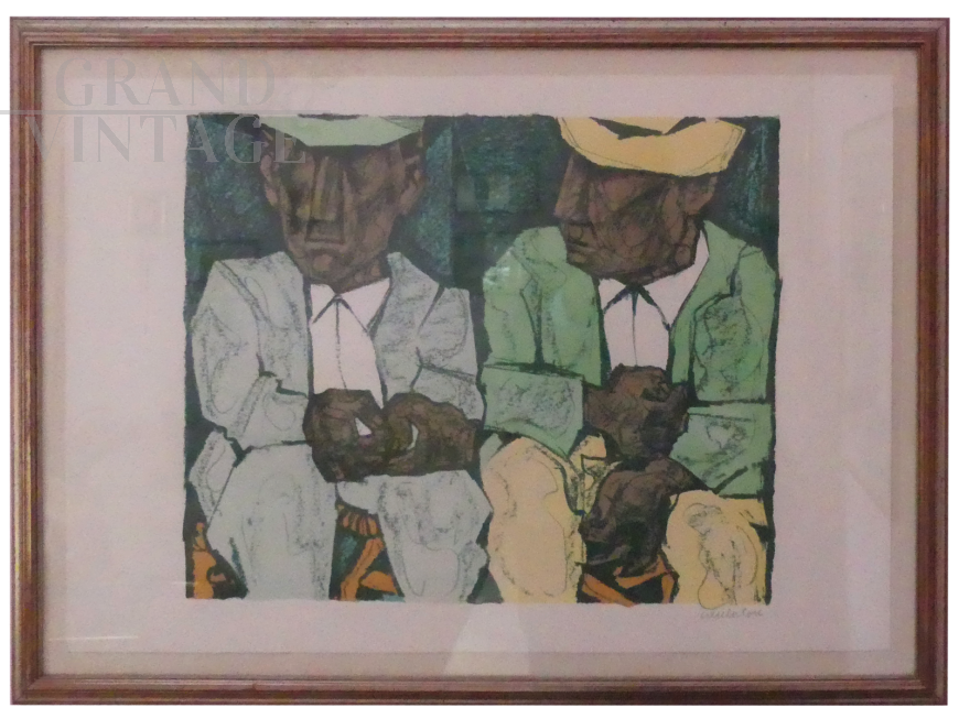 Uomini su panchina - Opera di Domenico Cantatore, originale e firmata, anni '80.