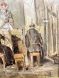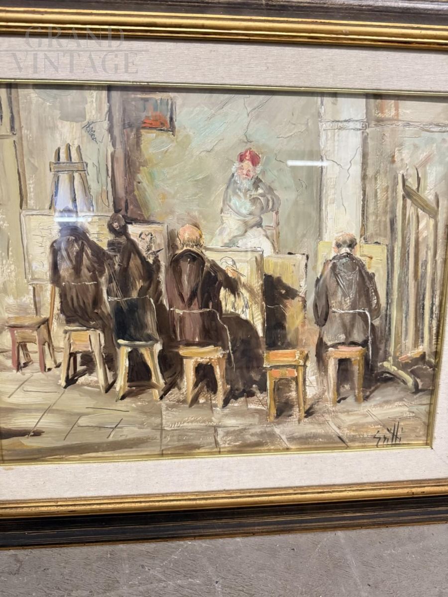 Dipinto di frati artisti in atelier, olio su tela firmato Grilli, XX secolo