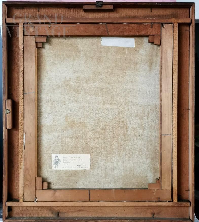 Quadro olio su tela Neve a Bardonecchia di Renzo Ravazzotti, firmato e datato 1965, misure 75 x 65 cm con cornice, 60 x 50 cm solo tela. Piccolo strappo alla tela di 2/3 cm facilmente riparabile.