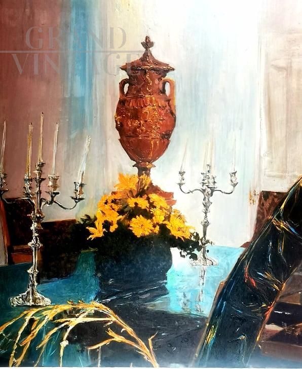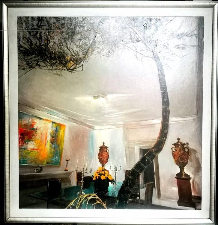 Quadro di Roberto Donatelli, olio su faesite, raffigurante Interni, realizzato nel 2001, firmato e datato sul retro. All'acquirente viene fornita l'autentica dell'opera.