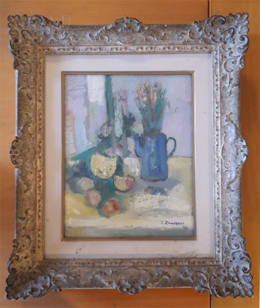 Dipinto di Sergio Zambelli con natura morta astratta, olio su tela, firmato e datato 1972.