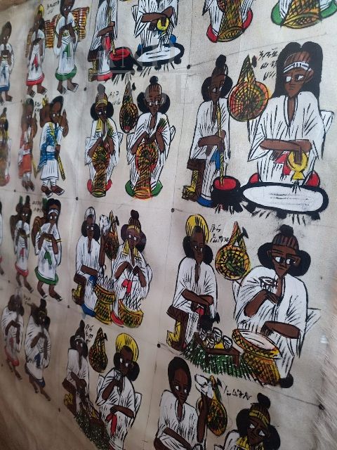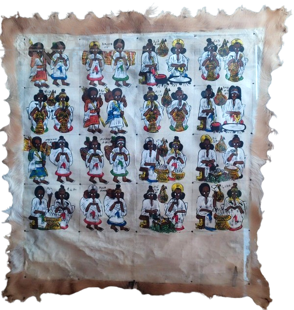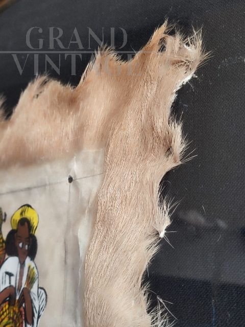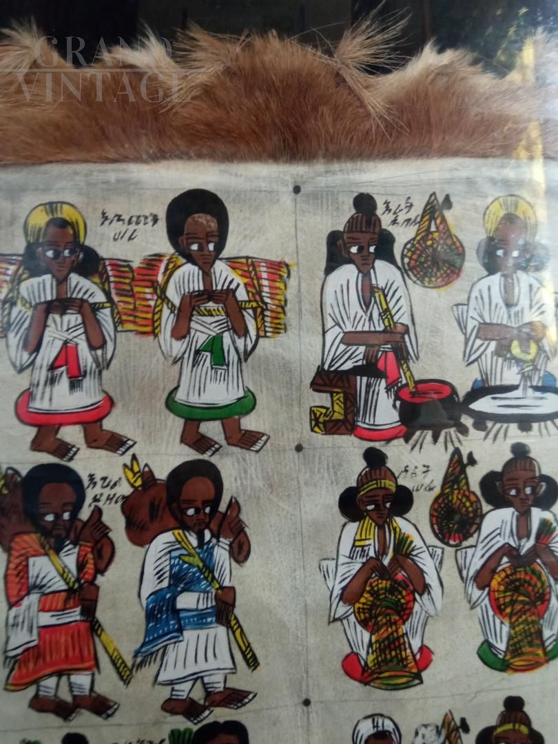 Dipinto etnico etiope su pelle di gazzella lavorata a mano, raffigurante scene di vita in un villaggio africano, in tutto 12 scenette con scritte in lingua liturgica copta Gee'ex. L'operaè completa di cornice in legno, come da foto.