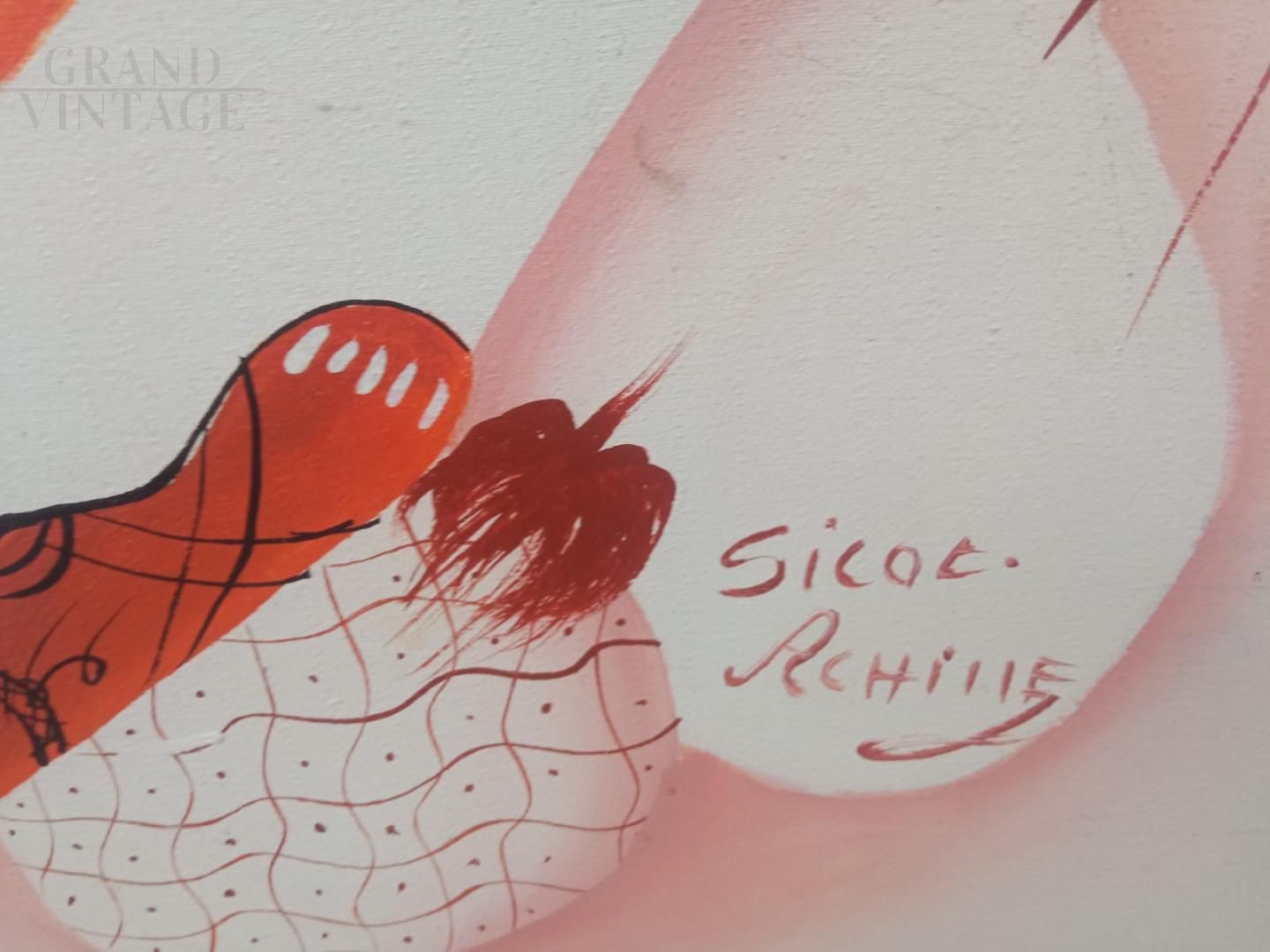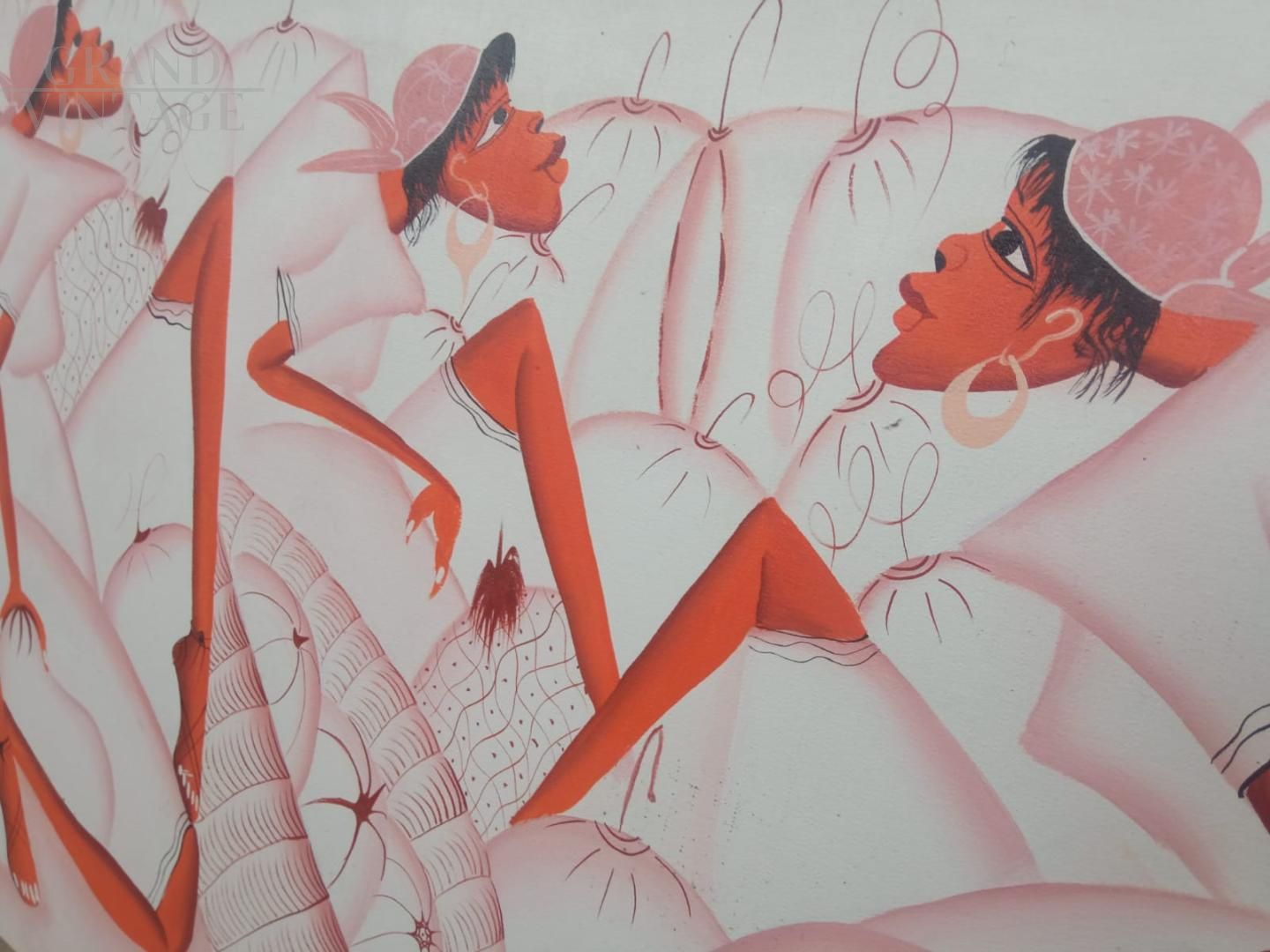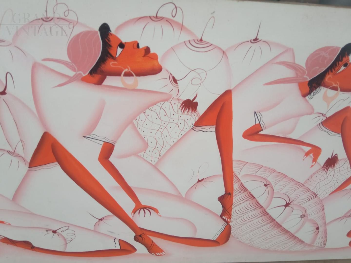 Dipinto etnico olio su tela applicato su pannelli di legno firmato Achille Sicot, raffigurante donne africane che raccolgono dei frutti, probabilmente il cacao.