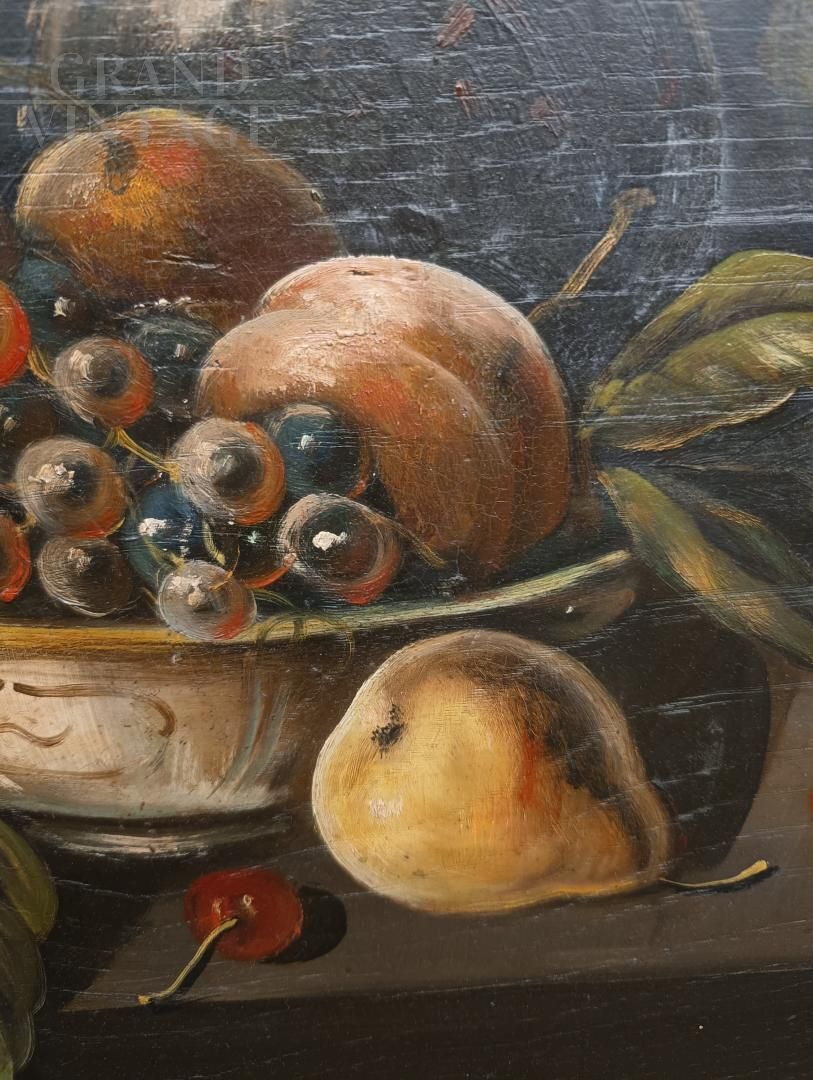 Dipinto antico fiammingo raffigurante natura morta autunnale, olio su tavola della metà del XIX secolo, di grande qualità e completo di cornice antica in legno intagliato e dorato. Buonissimo stato di conservazione.