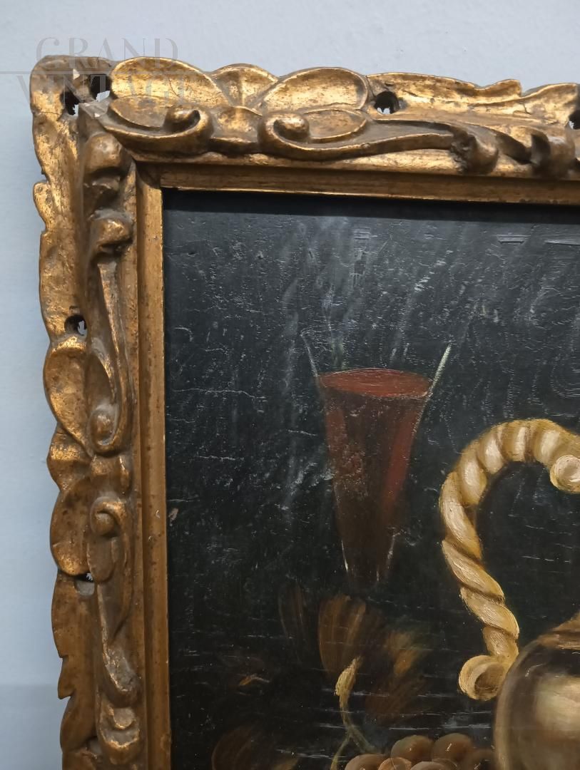 Dipinto fiammingo con natura morta, olio su tavola di metà XIX secolo