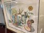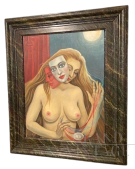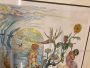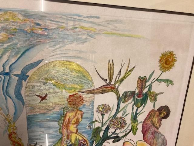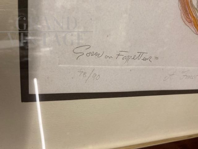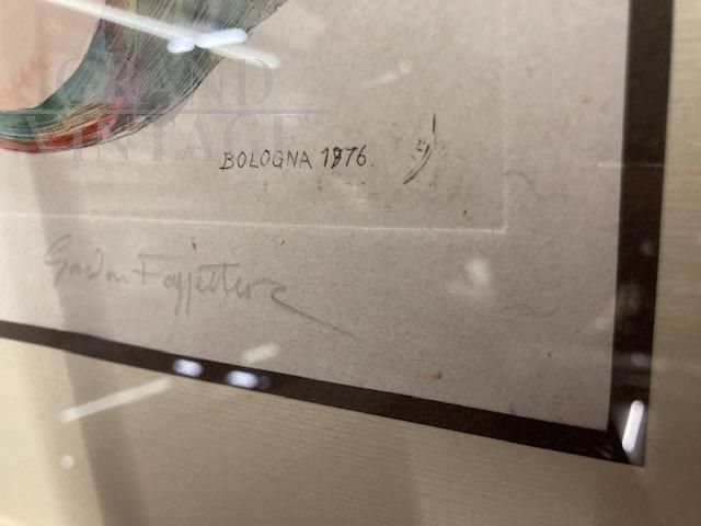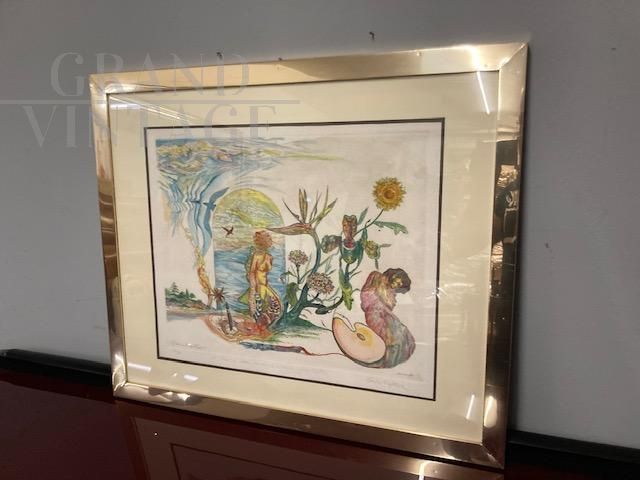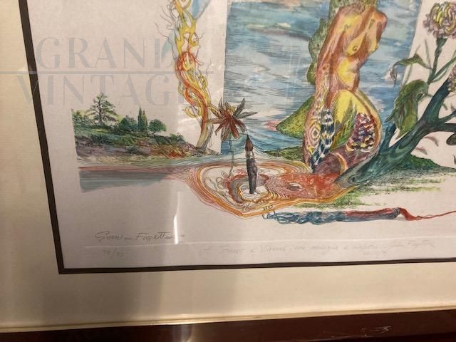 Incisione surrealista acquerellata di Gordon Farghetter del 1976 in cornice ottonata lucida.