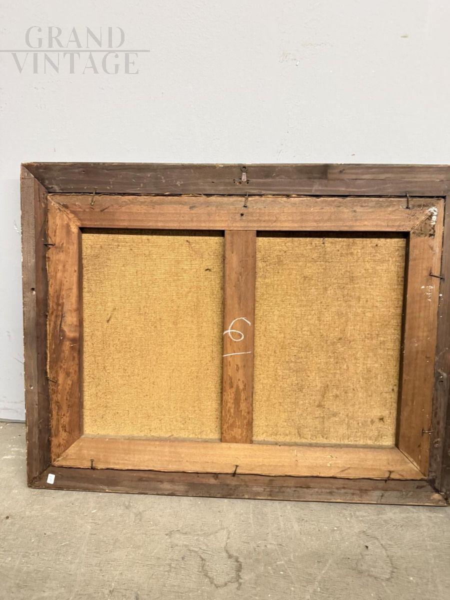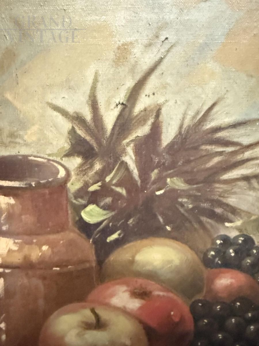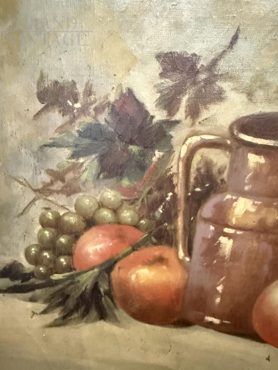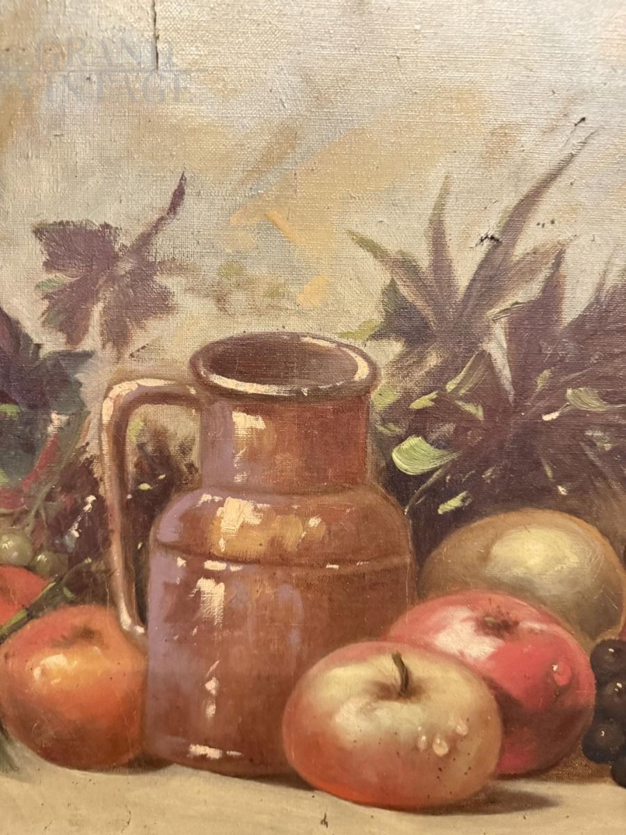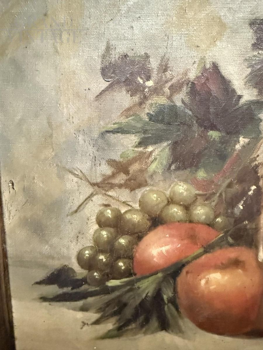 Dipinto di epoca liberty olio su tela raffigurante natura morta con frutta, Italia 1925, 60 x 55cm, firmato e datato in basso a destra, in cornice dorata coeva. Buono stato, bella qualità.