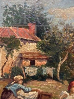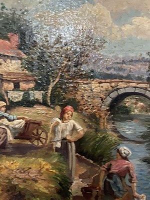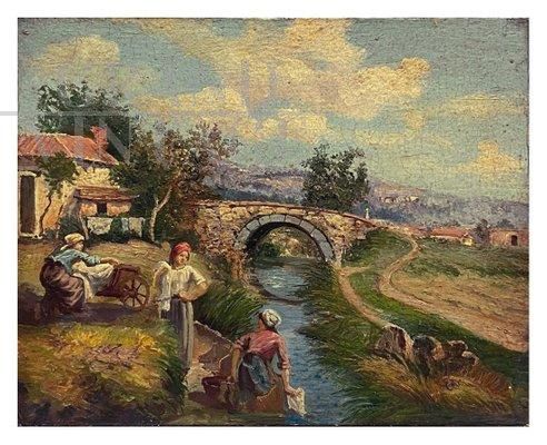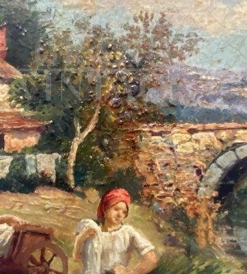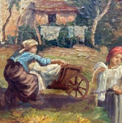 Dipinto Scena Campestre con lavandaie, Scuola Posillipo, olio su tavola