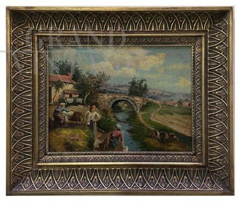 Dipinto con scena campestre, scuola Posillipo, olio su tavola. Il pittore ritrae alcune lavandaie mentre stanno svolgendo il loro lavoro in riva ad un corso d’acqua. Sullo sfondo un paesaggio campestre. Il quadro ispira un sentimento di tranquillità e dolcezza.