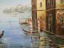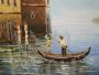 Dipinto olio su tela di fine XX secolo, montato su cornice dorata, raffigurante una scena veneziana con figura e gondola.
