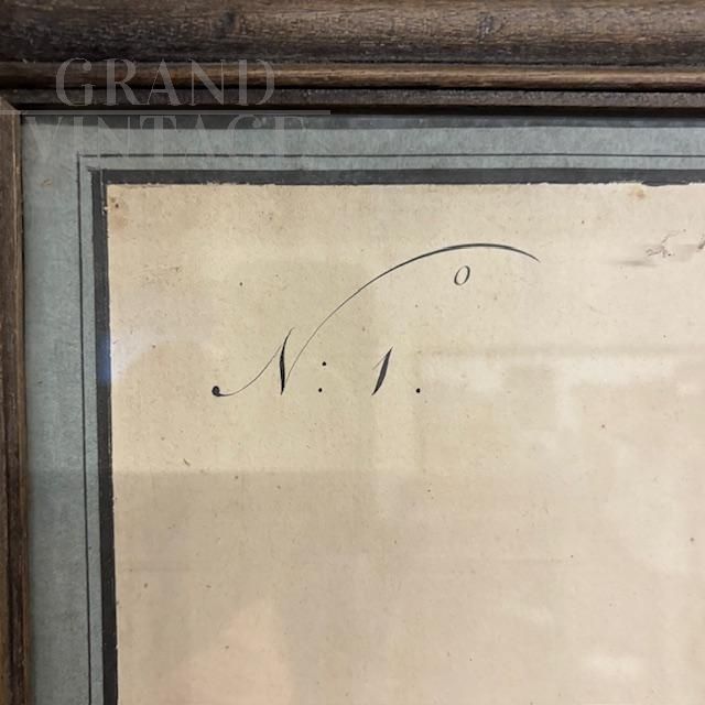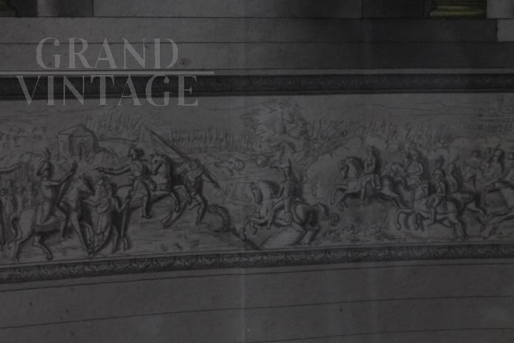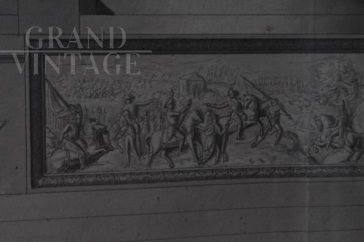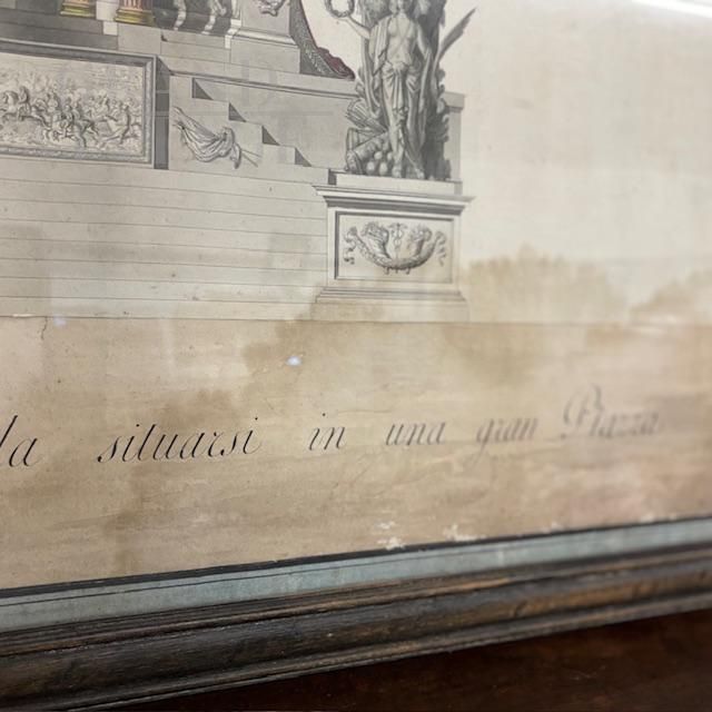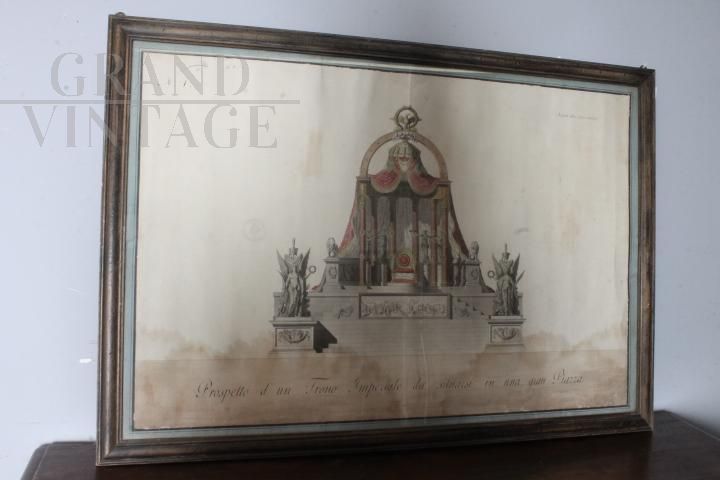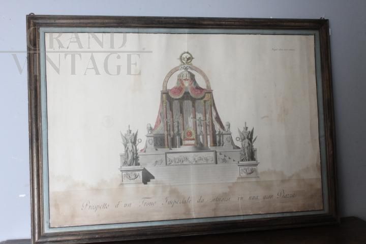 Disegno antico dei primi dell'800 risalente al periodo Impero raffigurante uno studio prospetto di Trono Imperiale in una grande piazza, completo di cornice e vetro.