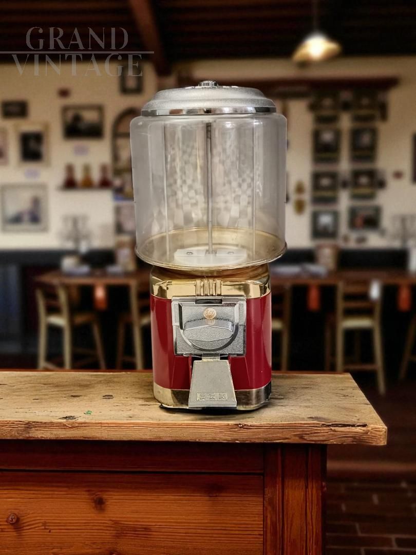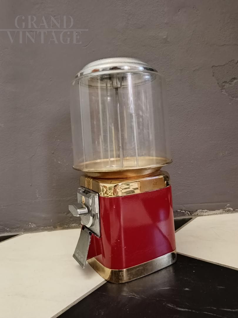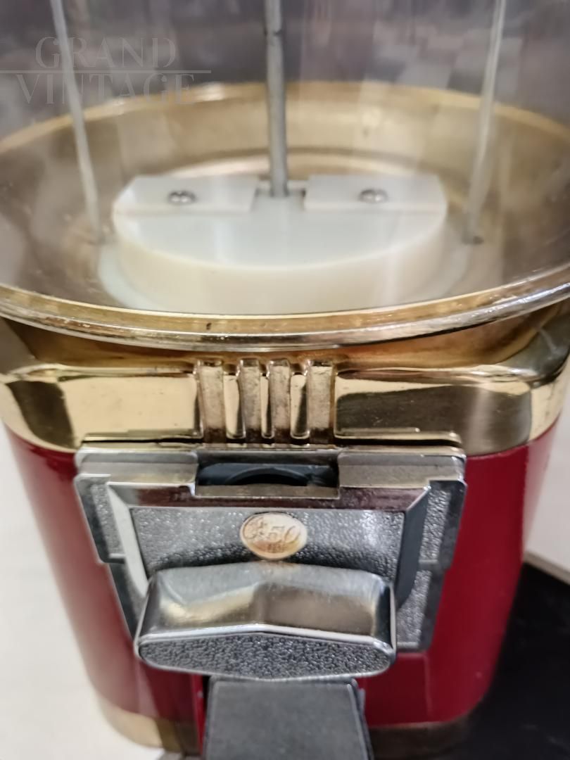 Bellissimo distributore di caramelle vintage da bancone della marca Beaver in colore bordeaux, con dettaglio del bordo in oro cromato anziché argento, perfettamente funzionante con monete da 50 centesimi ed utilizzabile per feste o in locali, o per dare un tocco divertente alla casa.