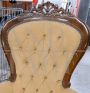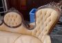 Set di divano e poltrona in stile rococò nuovo, in ottime condizioni poiché rimasto invenduto da magazzino, molto particolare lo schienale asimmetrico del divano. Il set è rivestito in velluto color crema, con spalliera imbottita trapuntata.