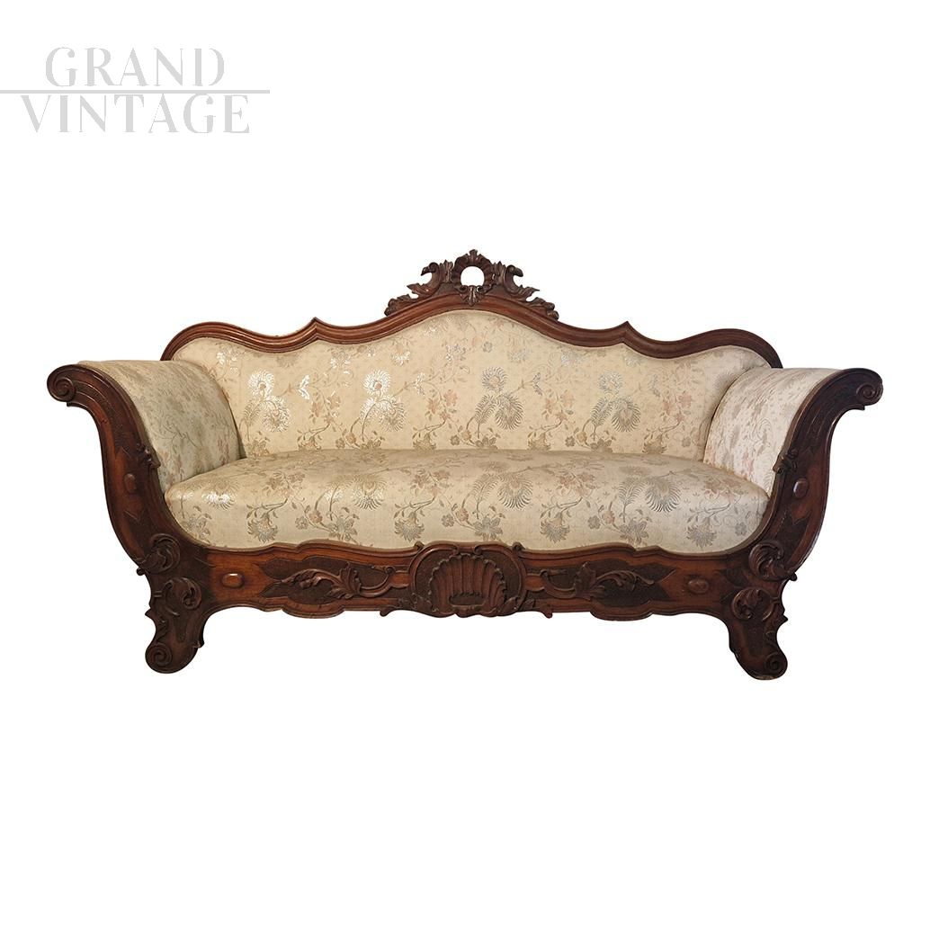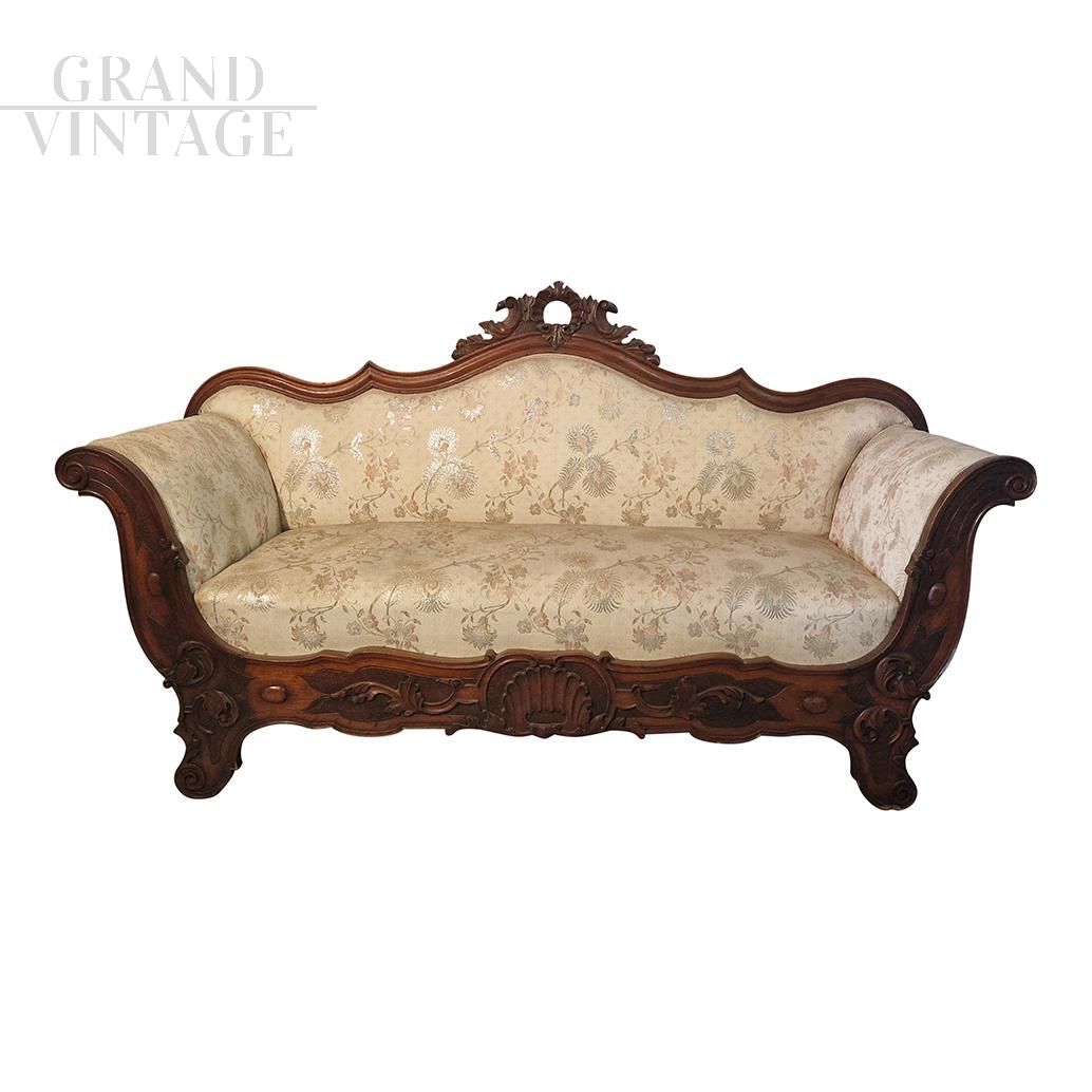 Divano a barca antico di epoca Luigi Filippo con struttura in noce massello intagliato a mano e tappezzeria in tessuto damascato beige con motivi floreali. Il divano è in un buono stato di conservazione.