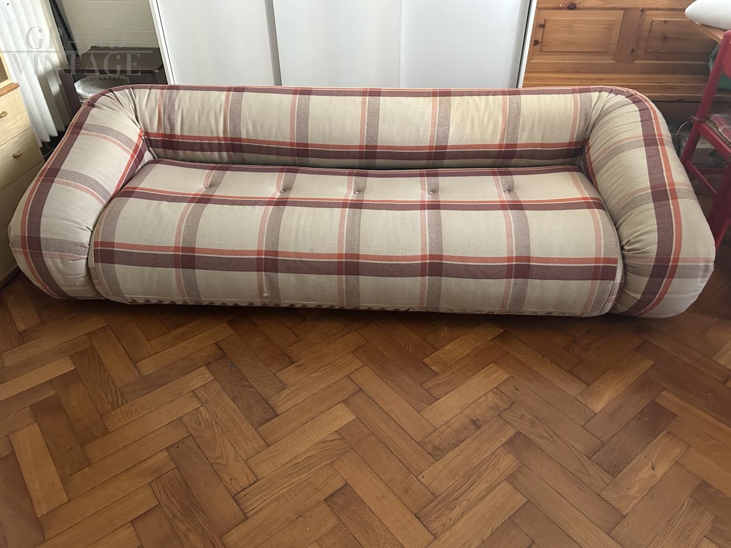 Divano Anfibio di Alessandro Becchi per Giovannetti in tessuto ecru a quadroni, originale anni '70. il divano è in buone condizioni, ha solo qualche piccolo buchetto sulla seduta e nella parte inferiore.