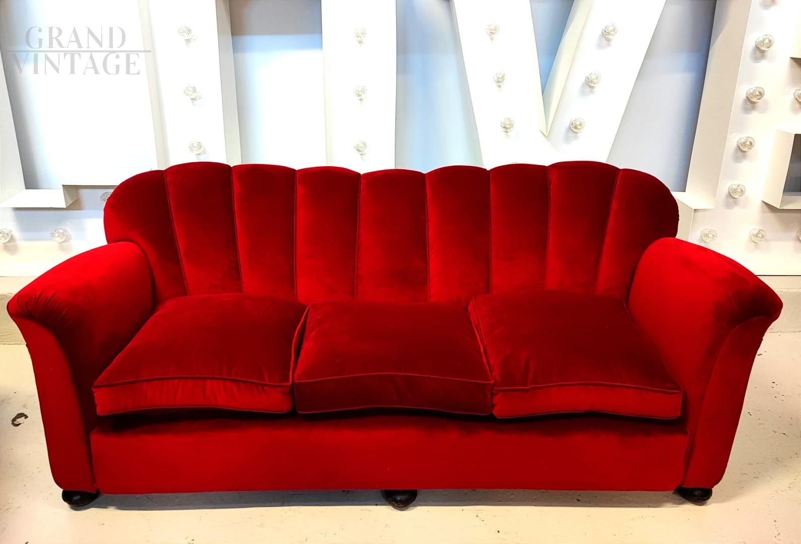 Divano vintage anni '40 completamente restaurato e rivestito con nuovo velluto rosso anti macchia di ultima generazione. Proviene da un’antica famiglia nobile italiana.