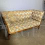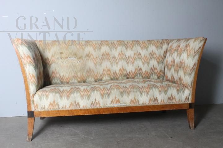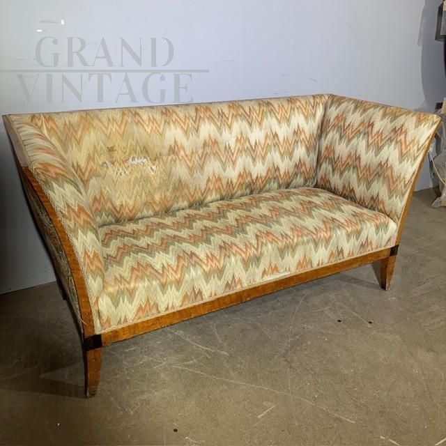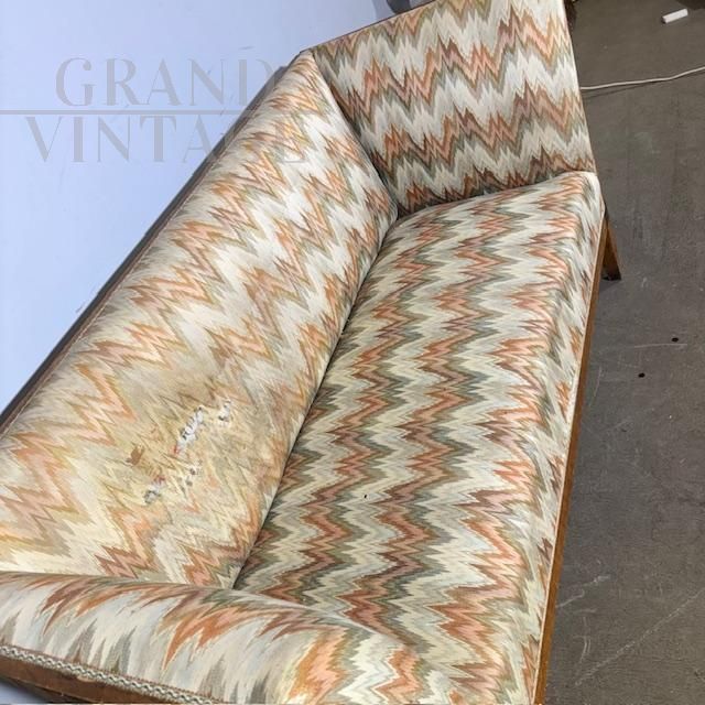 Divano antico del '700 di epoca Luigi XVI realizzato in legno di noce e tessuto con geometrie, perfetto anche da centro, misure 170 x 66 cm. Molto bella la linea. Il divano è da restaurare, come da foto.