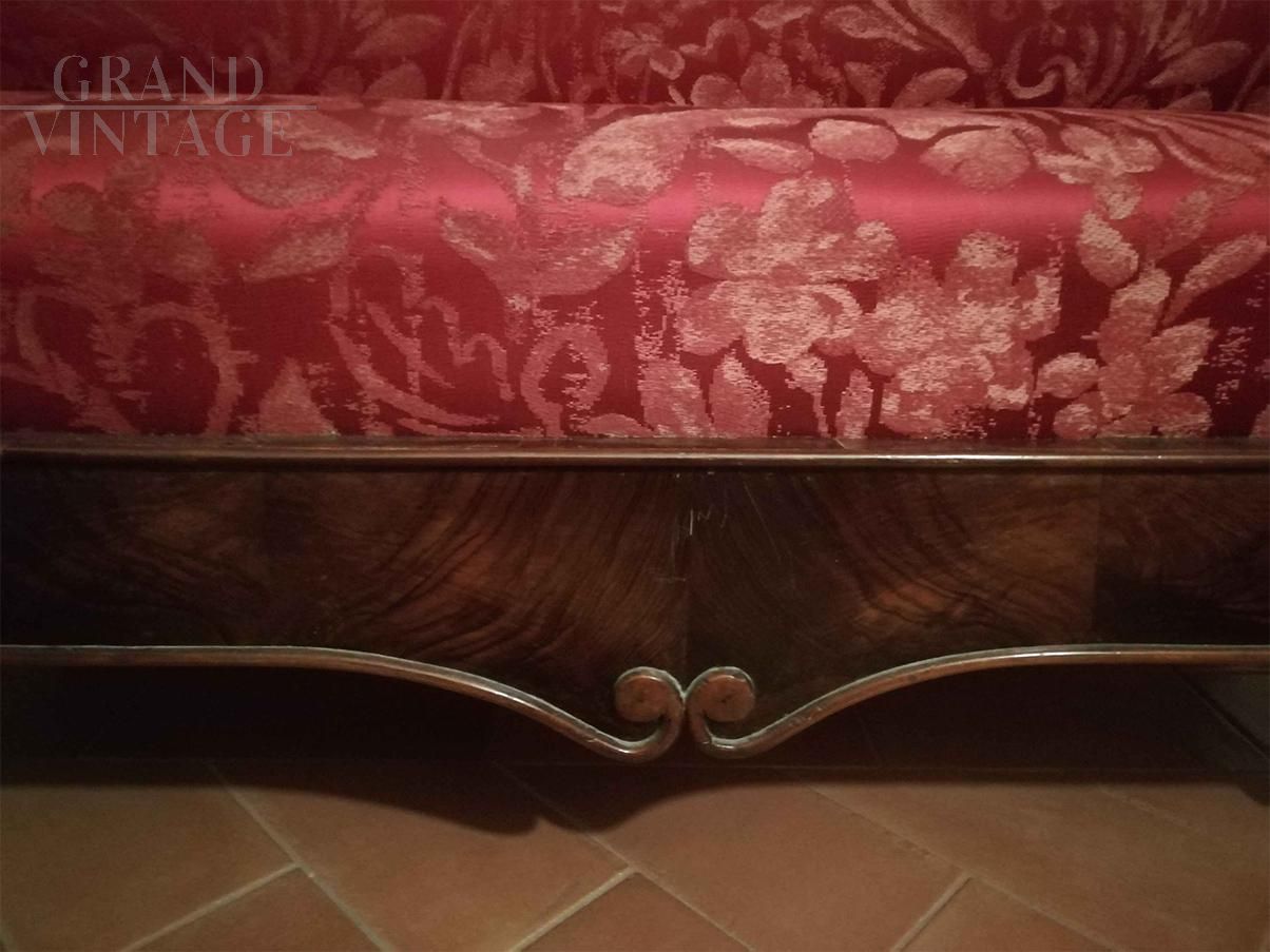 Divano antico a due posti di fine ‘800 - epoca Luigi Filippo, restaurato, in legno intagliato, con imbottitura su seduta, schienale e braccioli, e rivestimento in tessuto damascato rosso scuro marca Rubelli. Lo schienale è foderato in parte con tessuto rosso. Presenta qualche naturale segno del tempo e dell'utilizzo, come da foto.