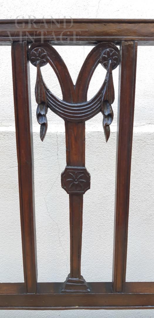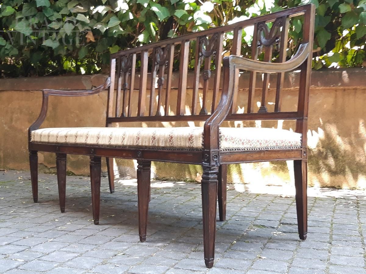 Divano divanetto canapè antico del '700 lombardo in piena epoca Luigi XVI, realizzato in legno di noce con schienale finemente scolpito e seduta imbottita. Raffinato divanetto canapè settecentesco con schienale in legno intagliato. La ricchezza del disegno lo distingue dalla moltitudine, i 5 piedi frontali a piramide rastremati lo caratterizzano, mentre l'integrità della struttura e della patina lo inquadrano in un'opera ricercata.