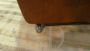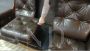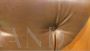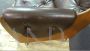 Divano della ditta G-Plan in pelle skai marrone, degli anni '70. Il divano ha delle rotelle ed una base in legno teak.