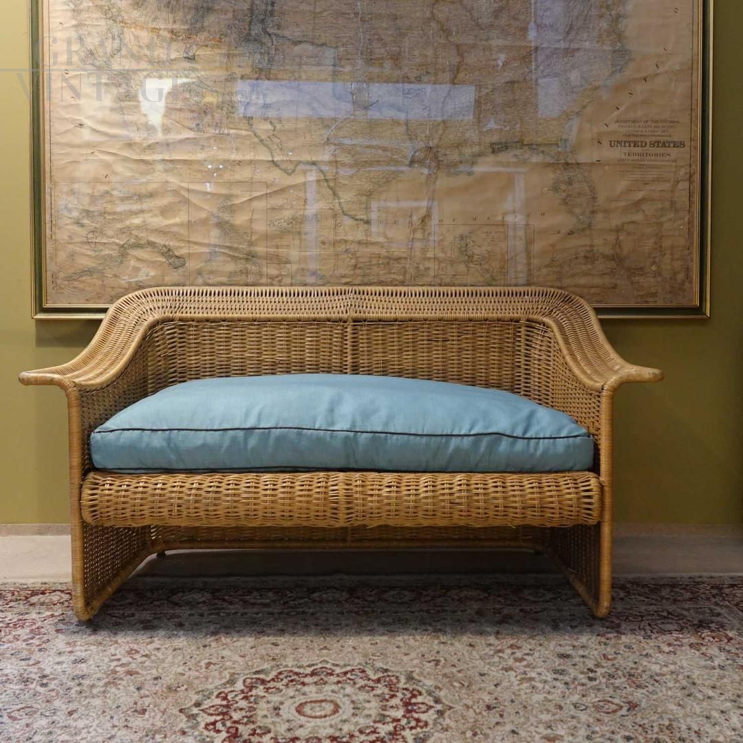 Divano vintage in bamboo e vimini con cuscino celeste, perfetto per creare atmosfere rilassate e naturali. La struttura intrecciata e il cuscino dai toni delicati donano un tocco vintage e mediterraneo, ideale per verande, salotti luminosi o allestimenti dallo stile boho e fresco.
