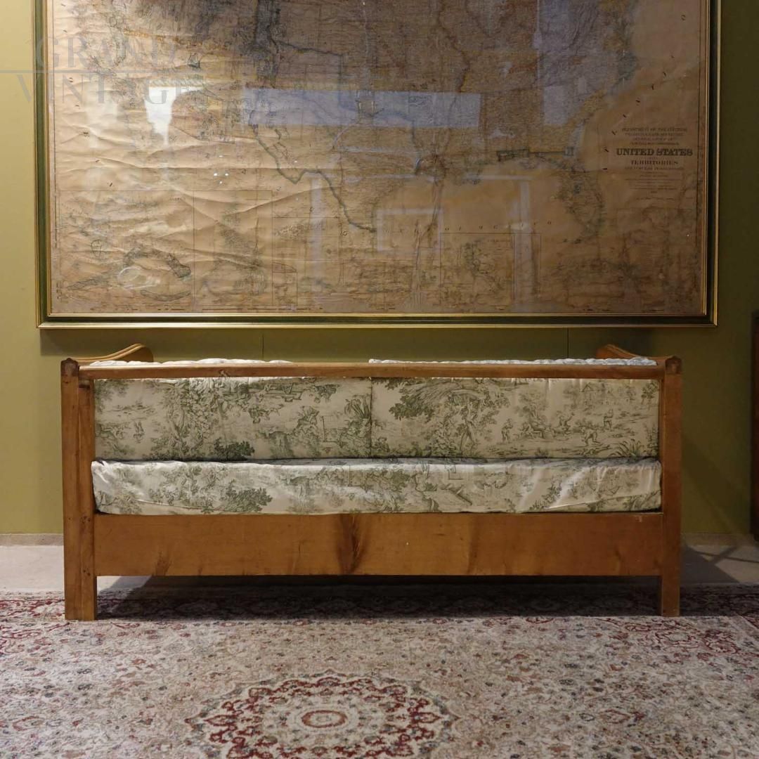 Bellissimo divano vintage nello stile di Paolo Buffa con la classica struttura in legno curvato, rivestito in tessuto toile de jouy, dall’anima rustica e accogliente, perfetto per ricreare atmosfere calde e rilassate. Le linee morbide e i materiali naturali evocano il fascino delle case di campagna, rendendolo ideale per ambienti dallo stile shabby, farmhouse o boho chic.