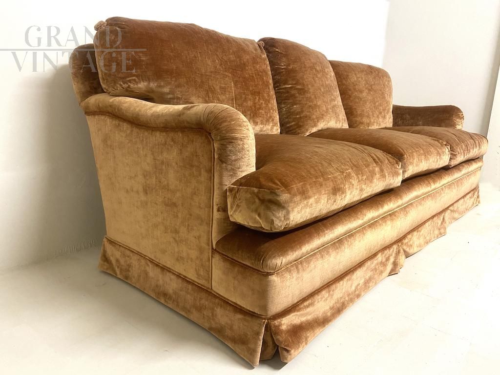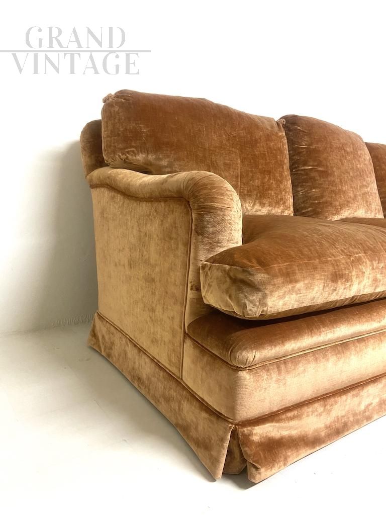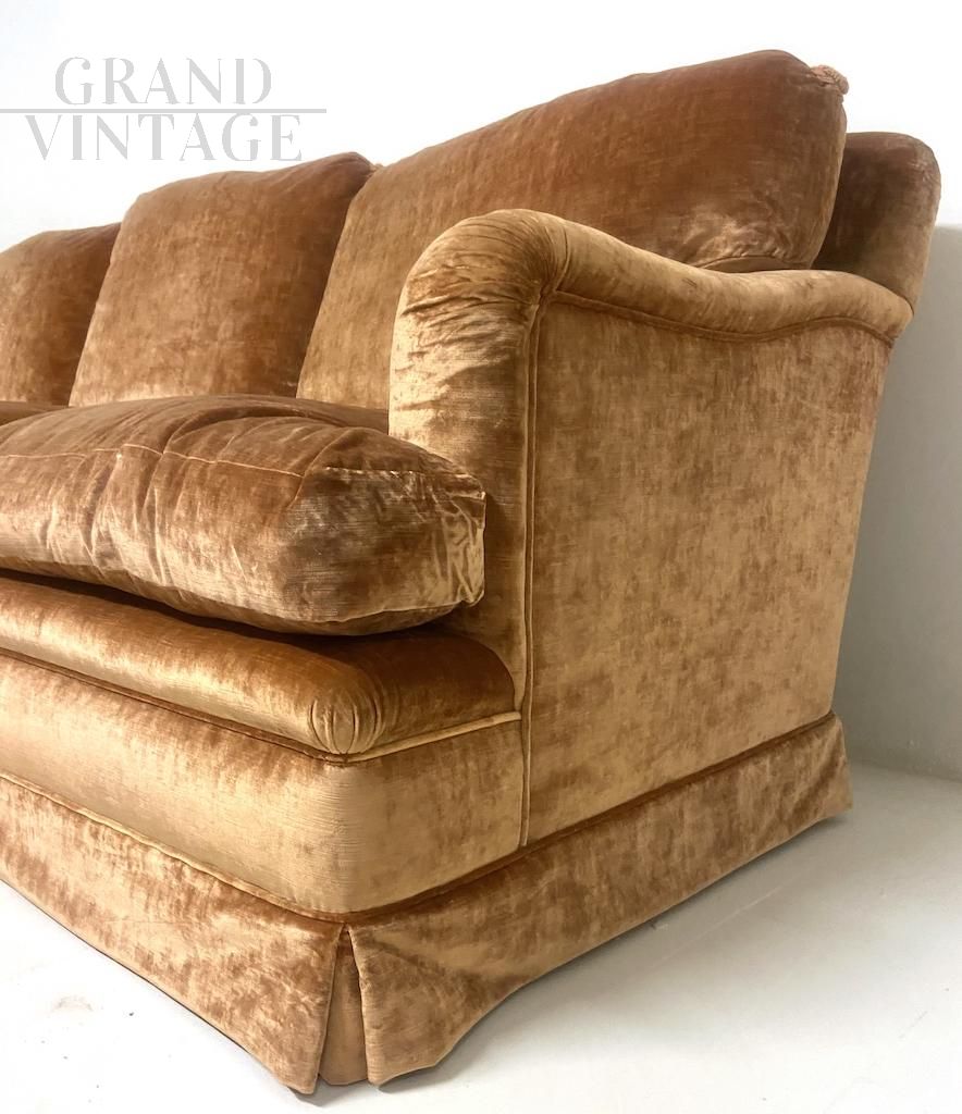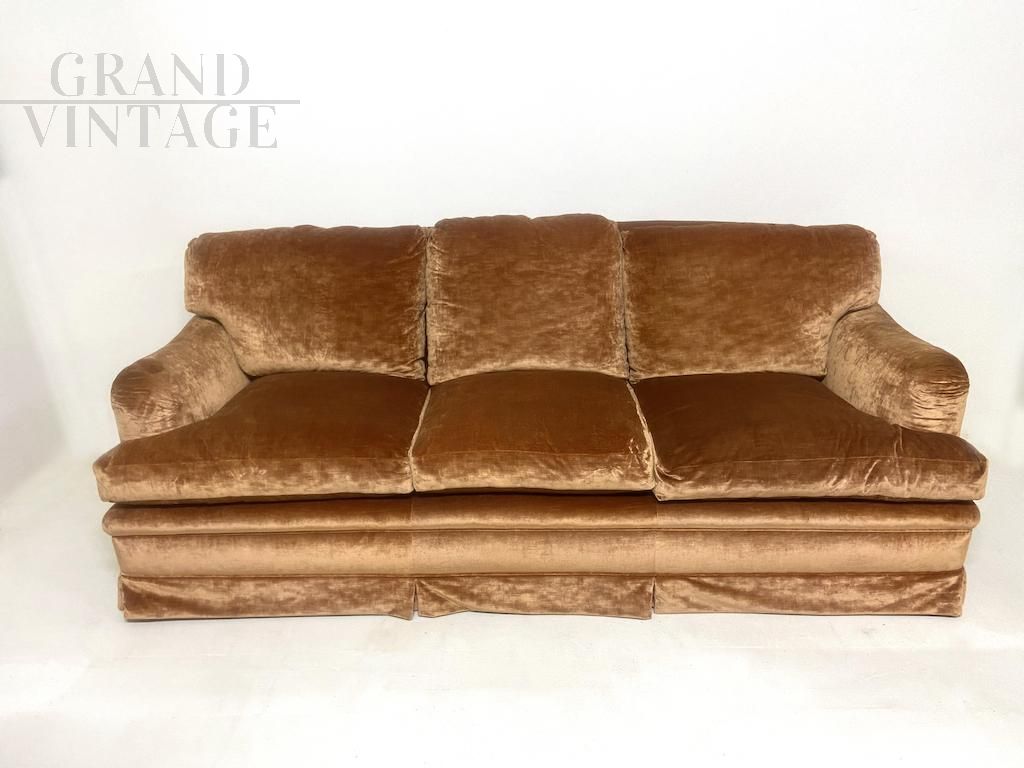 Raffinato divano vintage italiano con struttura classica interamente fabbricato e confezionato a mano, con rivestimento in velluto nobile di seta color tawny brown (fulvo) con tocchi di luce.
