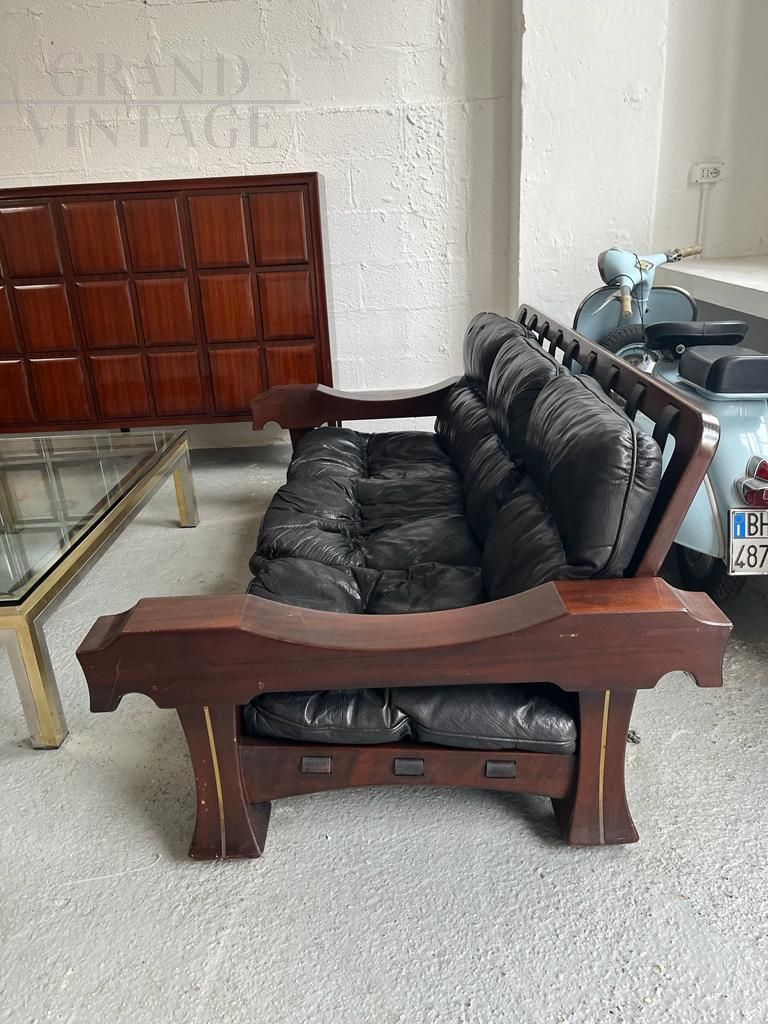 Divano modello Ussaro di Luciano Frigerio, design italiano anni '60, con struttura in legno, inserti in ottone, cinghie in cuoio e cuscini in pelle nera.