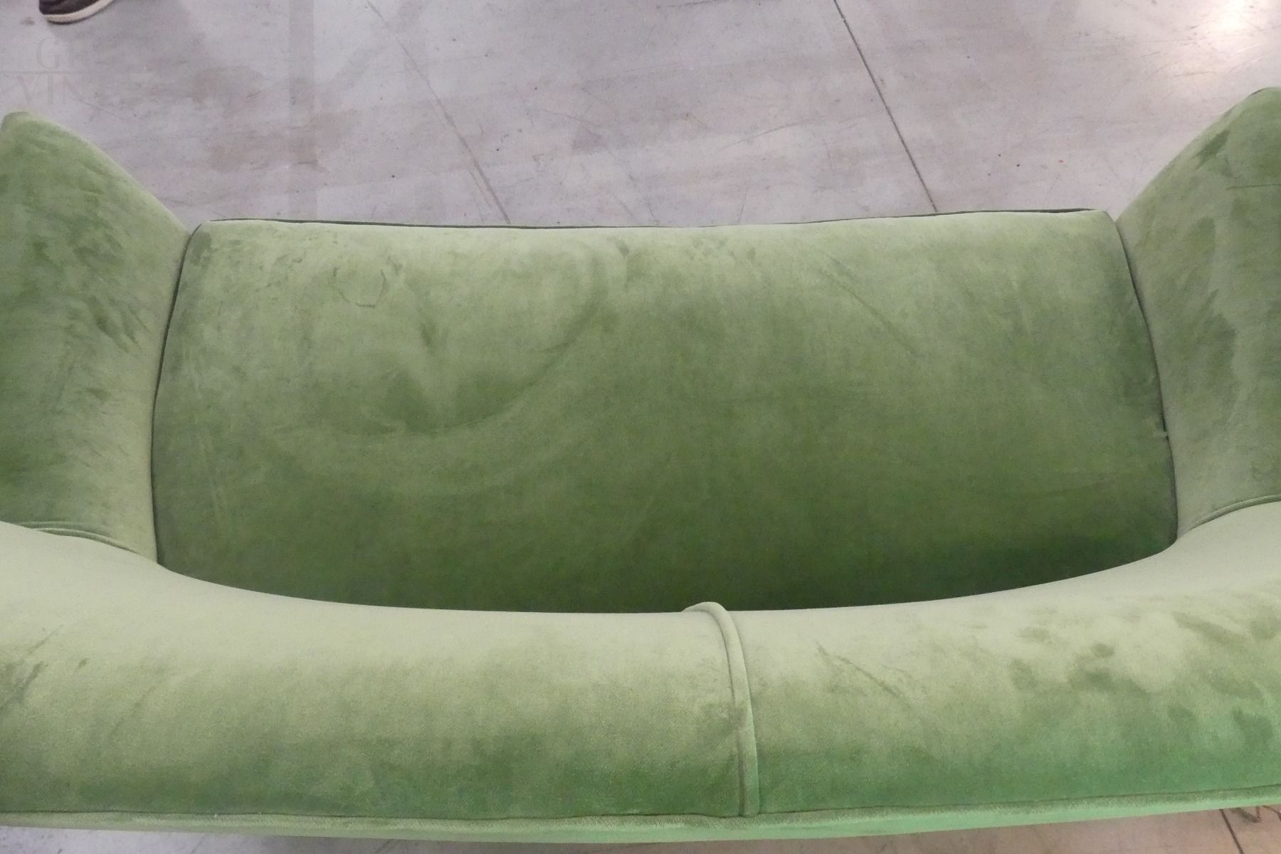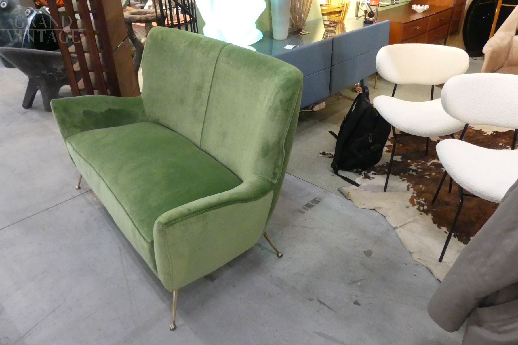 Divano classico di modernariato italiano in velluto verde salvia con piedi in ottone, in ottime condizioni, ritappezzato a nuovo.
