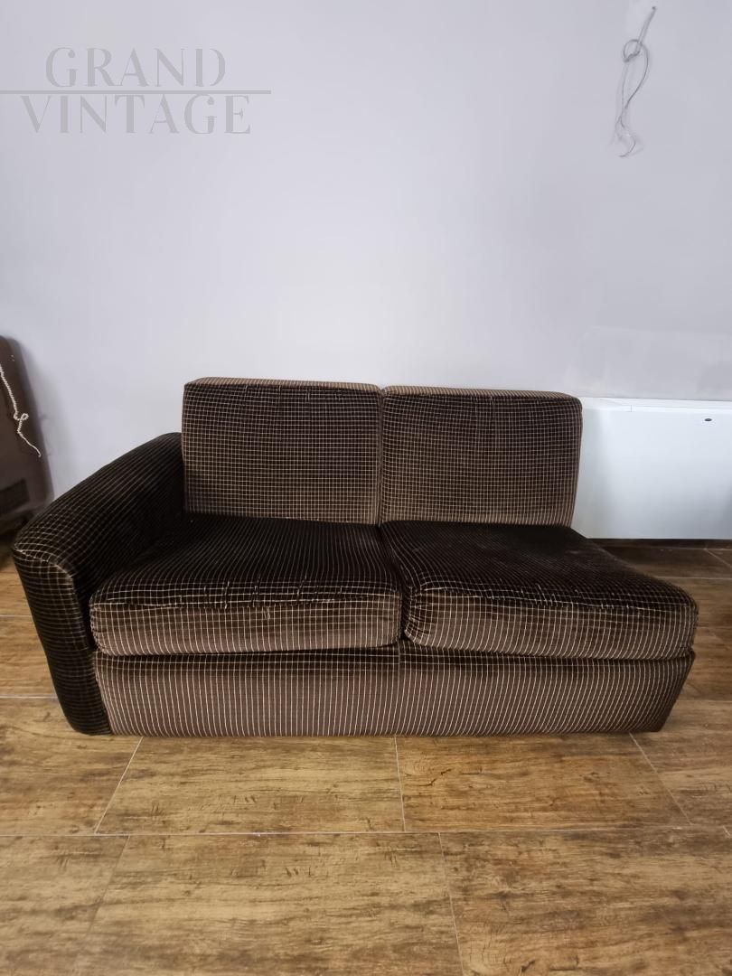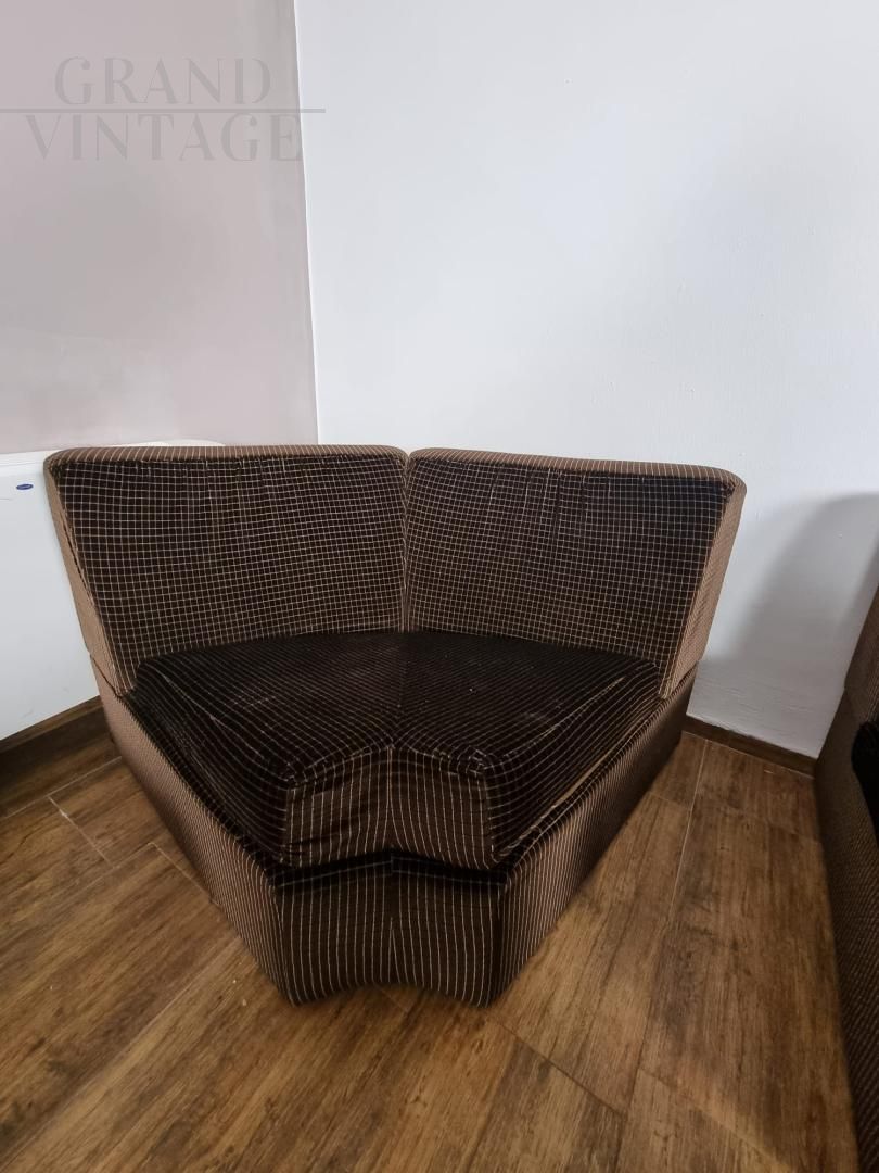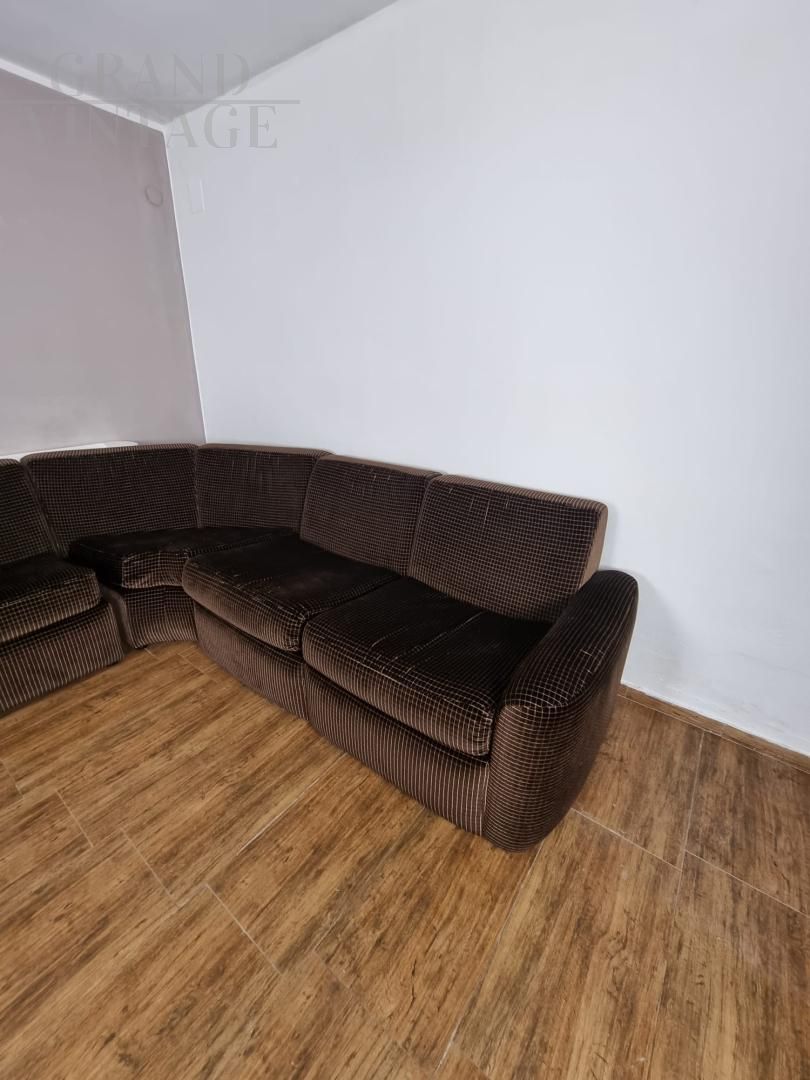 Divano anni '70 ad angolo a 6 posti in velluto di color marroncino con effetto rigato.