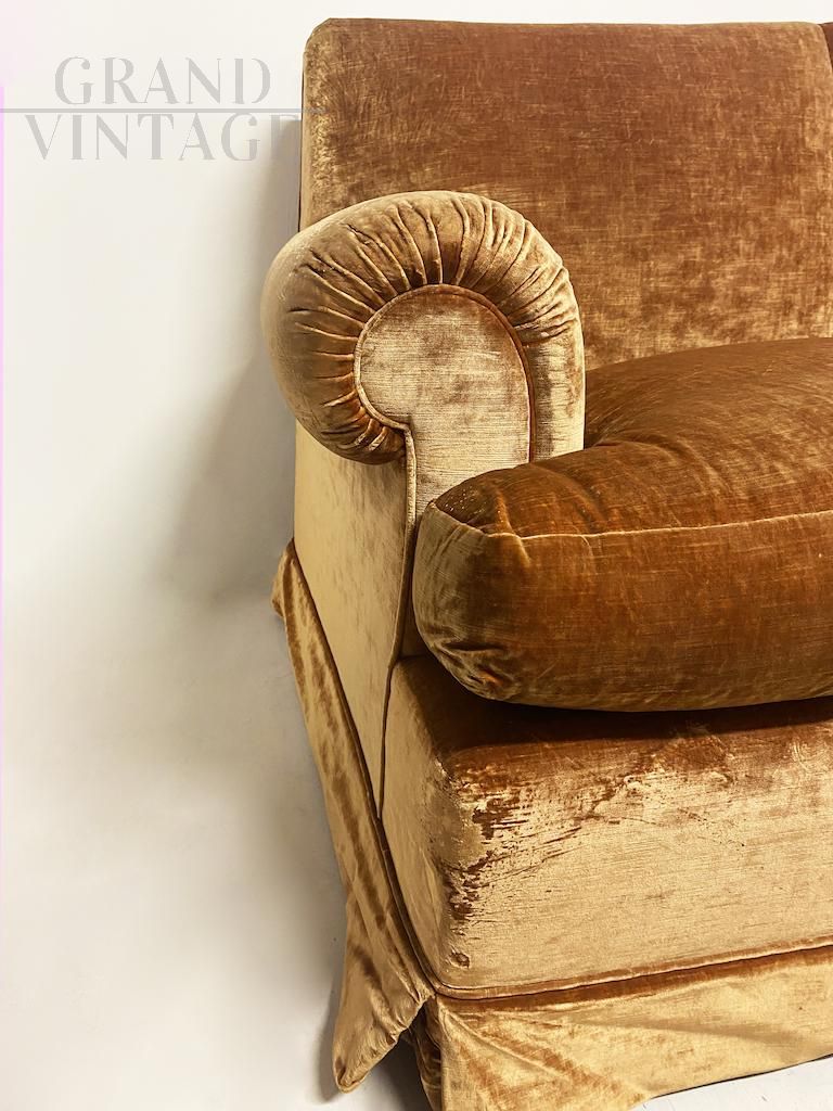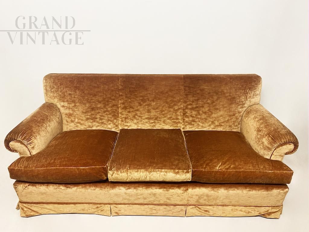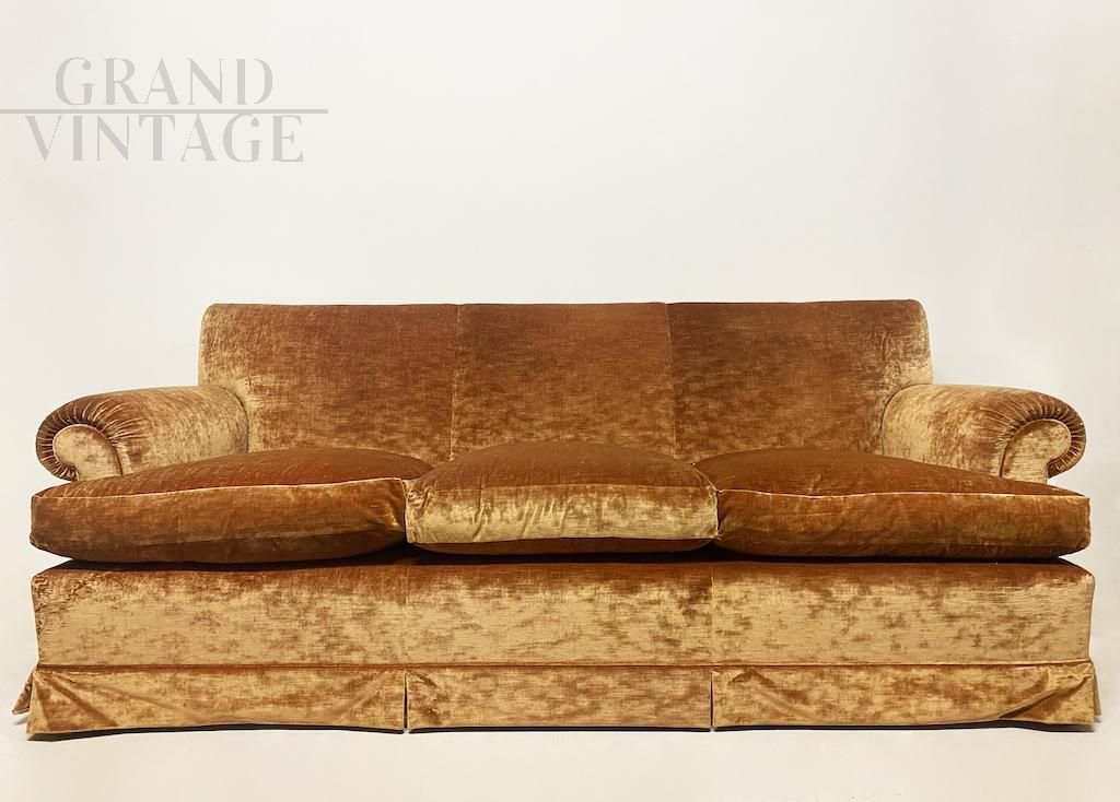 Raffinato divano vintage con struttura classica e braccioli arrotondati interamente fabbricato e confezionato a mano. Rivestimento in velluto nobile di seta color marrone fulvo - tawny brown con tocchi di luce.