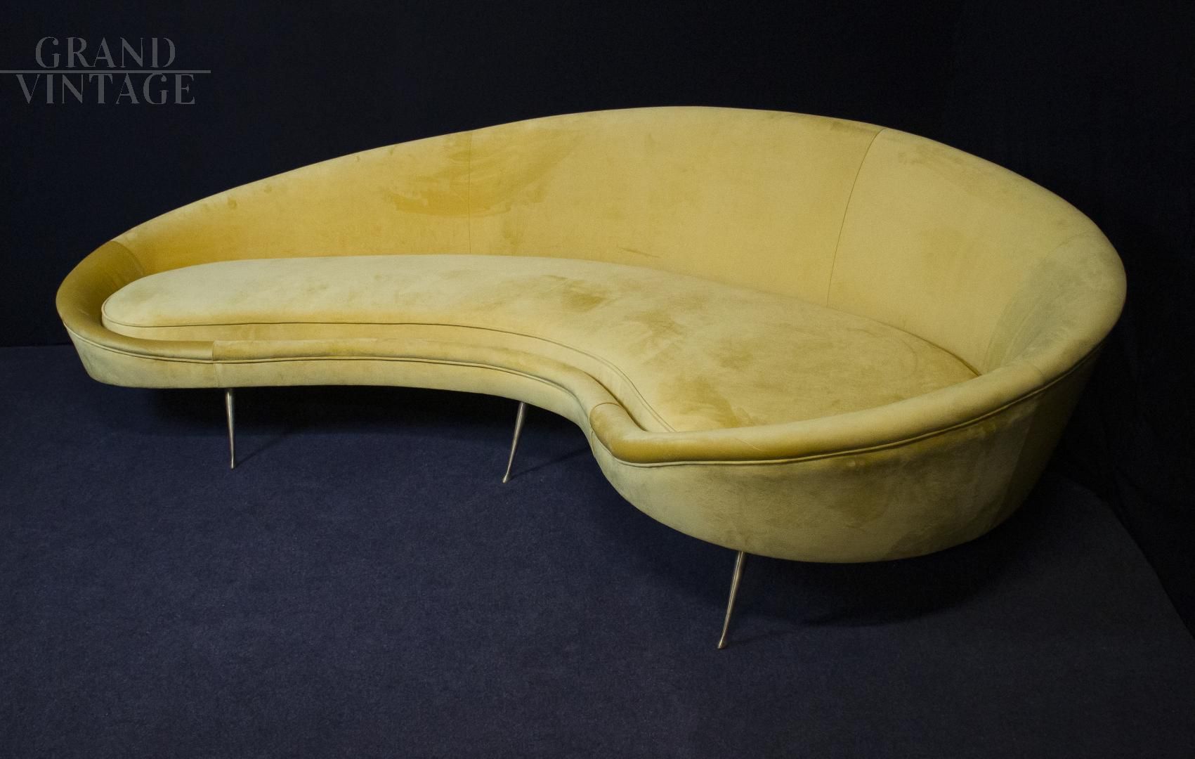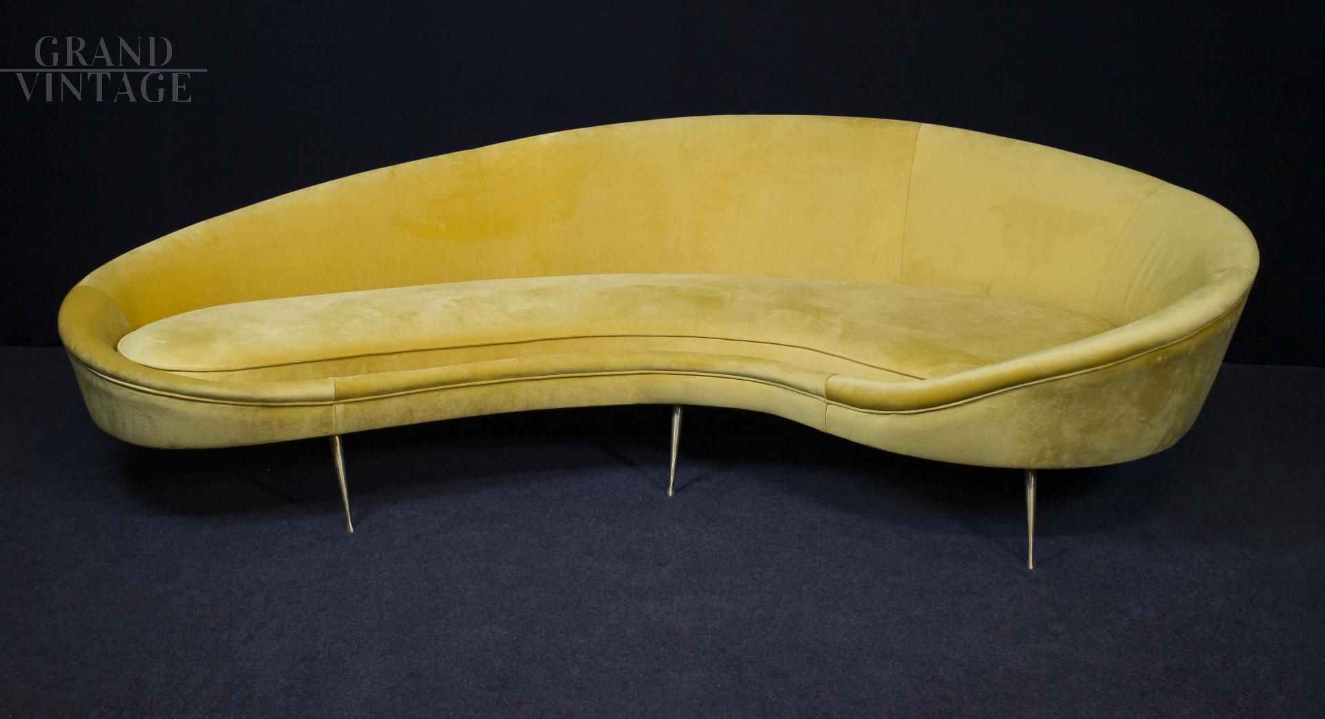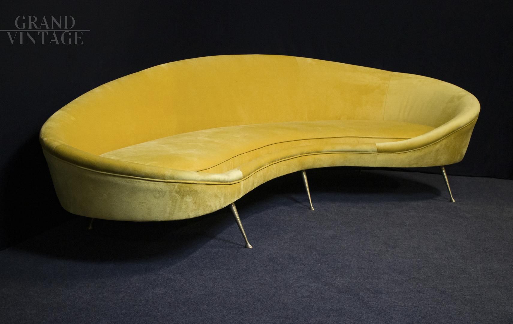 Divano vintage dalla bella linea sagomata, imbottito e rivestito in tessuto color senape/giallo, con piedini in ottone dorato.