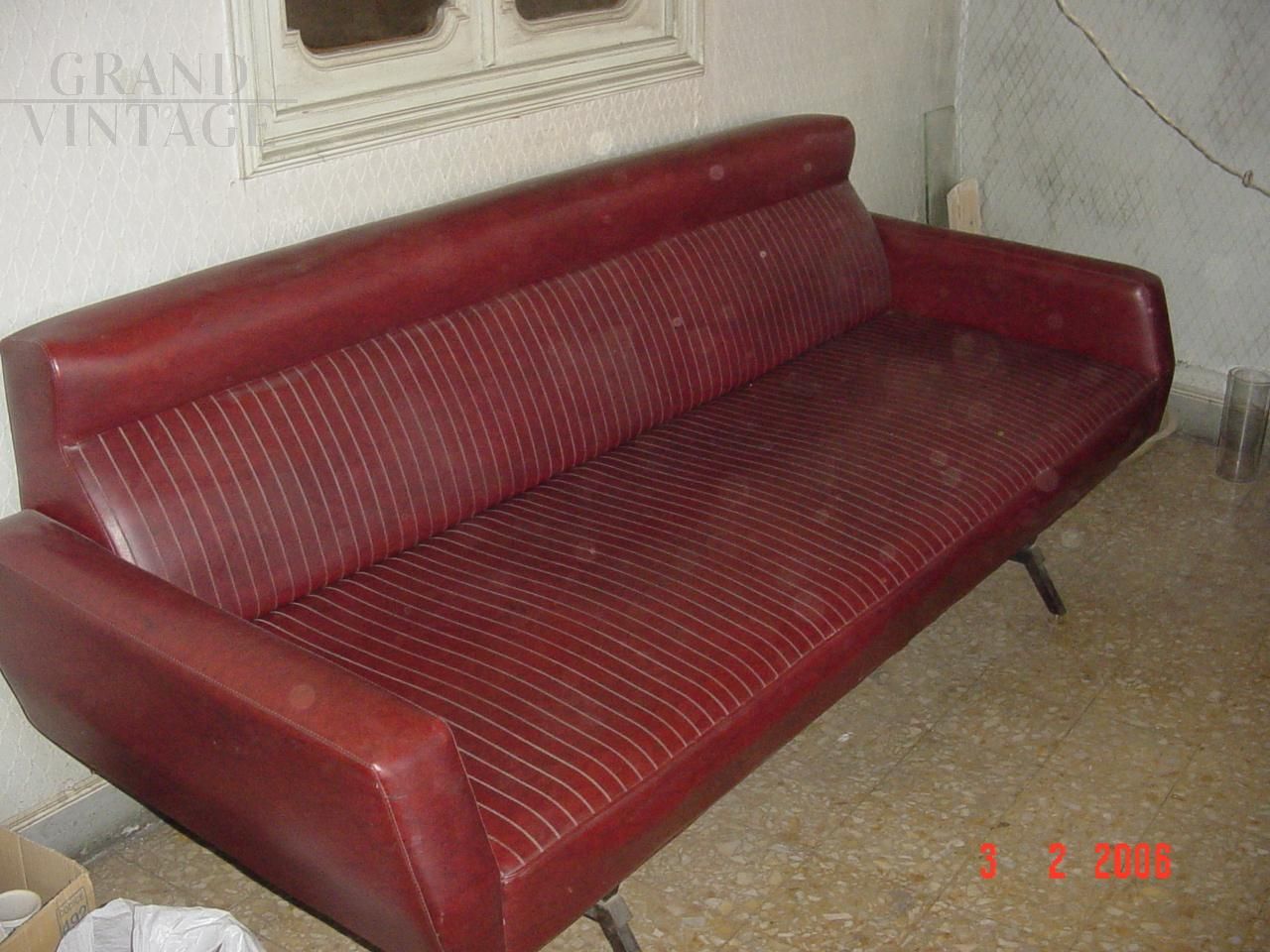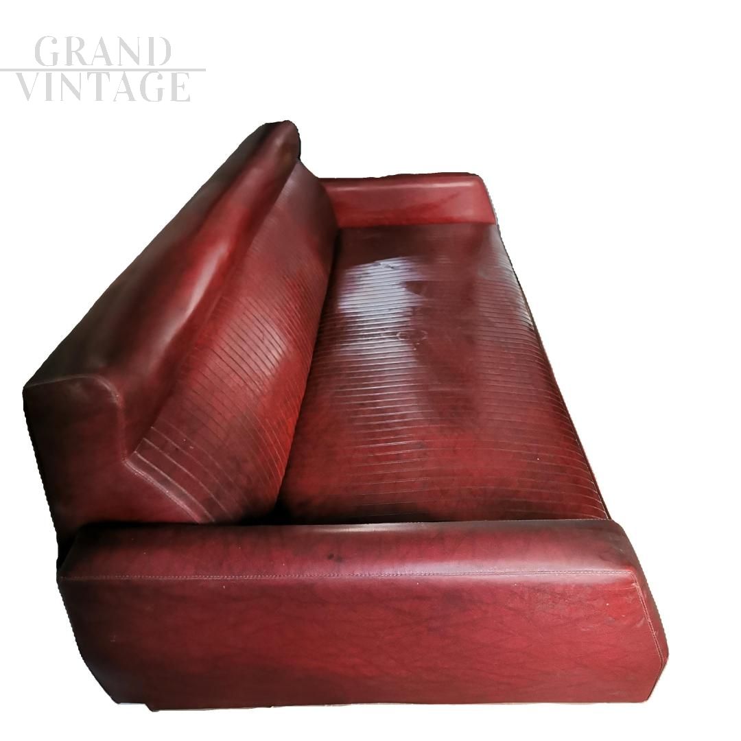 Divano vintage anni '50 a tre posti in vera pelle rossa, ben tenuto, adatto per uno stile industriale, per arredare negozi, cocktails bar, locali originali e di tendenza, loft...