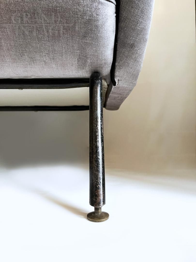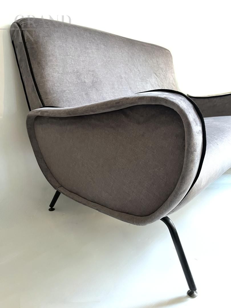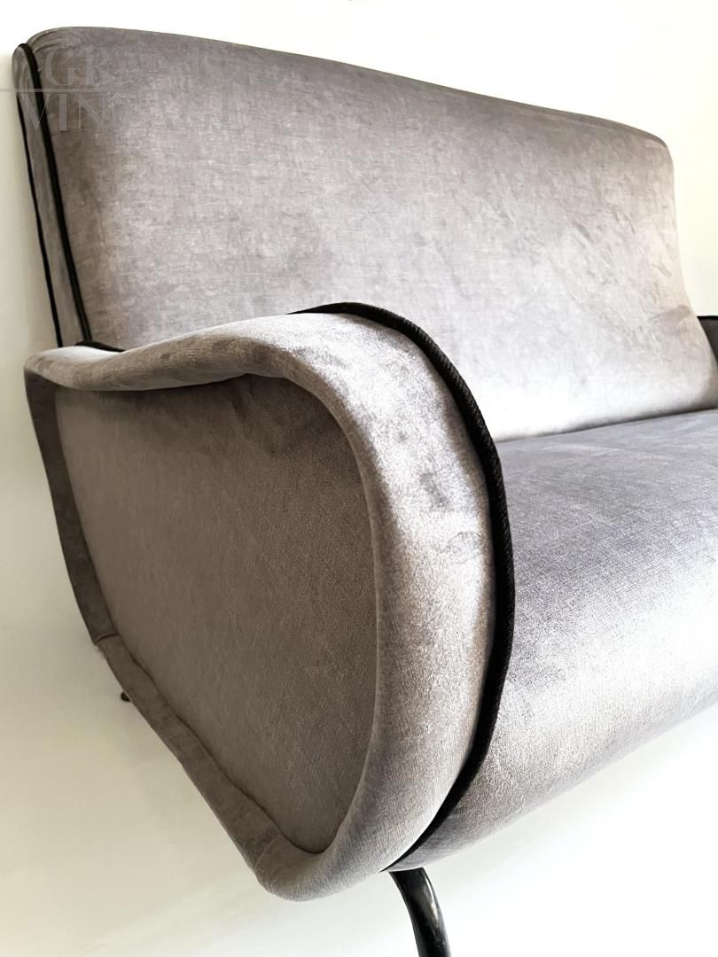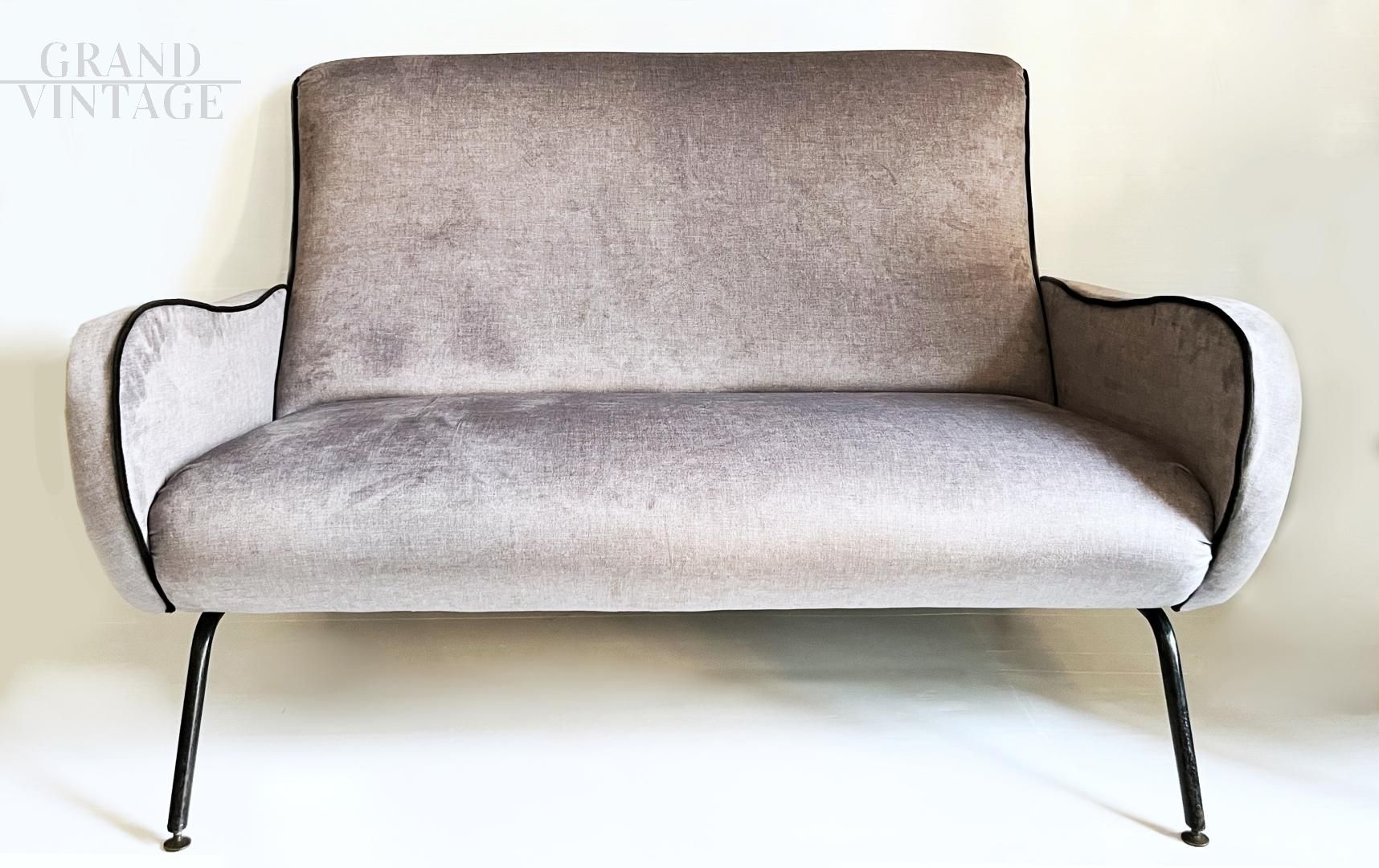 Divanetto vintage originale in stile Lady di Zanuso anni '50 interamente rivestito in velluto grigio acquaclean e piedini in metallo e ottone, di provenienza italiana.