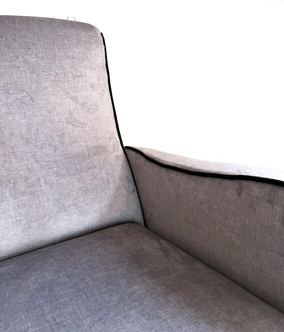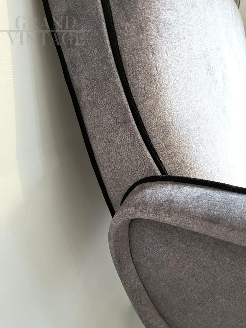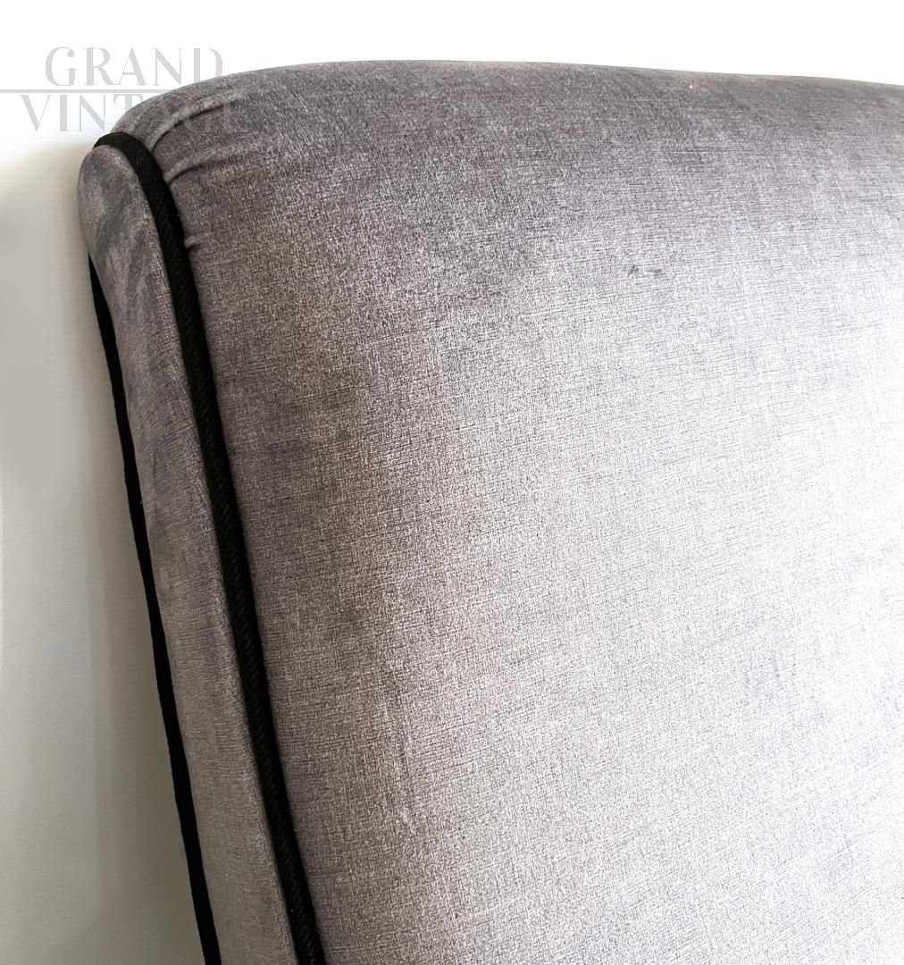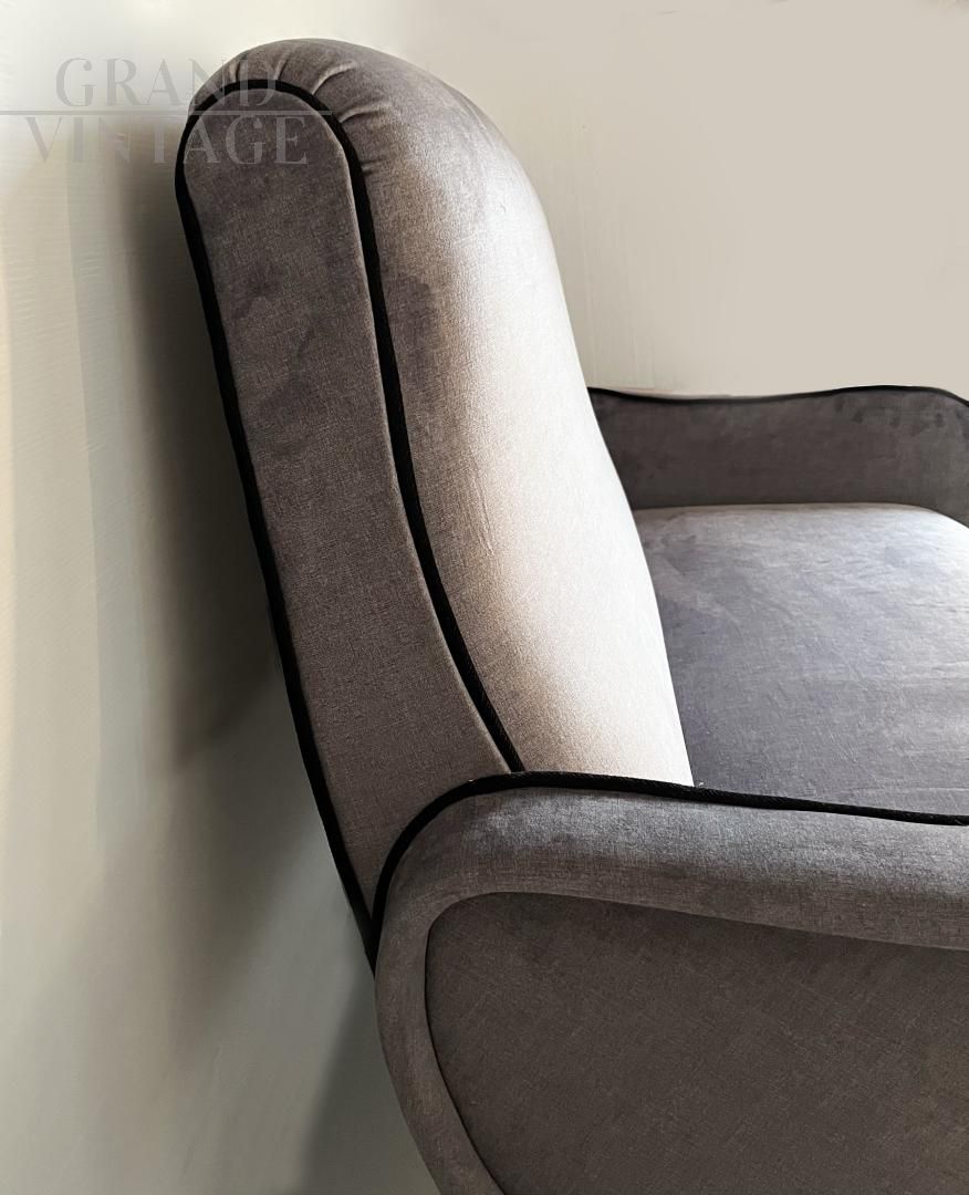 Divanetto vintage originale in stile Lady di Zanuso anni '50 interamente rivestito in velluto grigio acquaclean e piedini in metallo e ottone, di provenienza italiana.