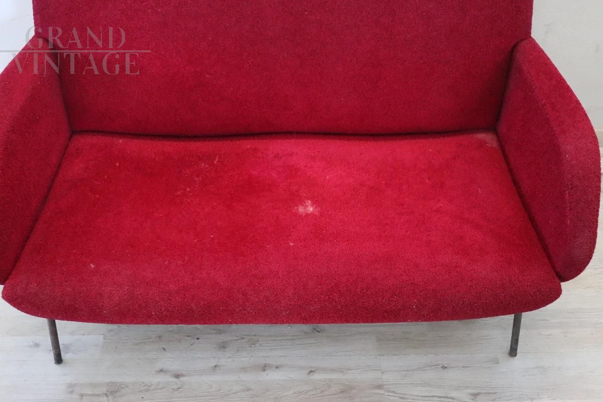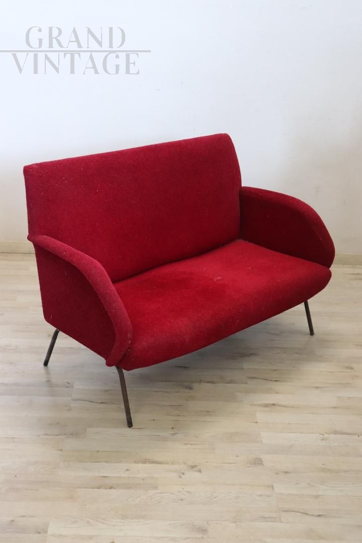 Divano design italiano anni ’50 con struttura in metallo, imbottitura in spugna e rivestimento in lana bouclé rossa. Il divano ha una linea in perfetto stile anni ’50 che richiama il design di Gigi Radice. Il divano ha una capacità di due posti a sedere, e grazie alle sue dimensioni ridotte è perfetto per stanze piccole, uffici e negozi. Si consiglia di sostituire l’imbottitura della seduta e il tessuto. Prezzo trattabile.