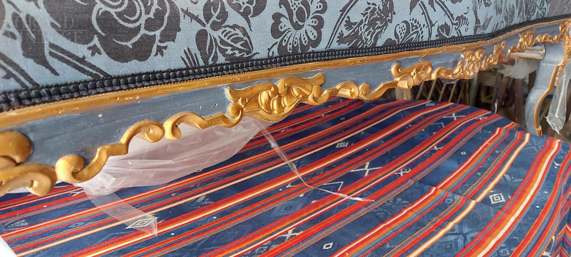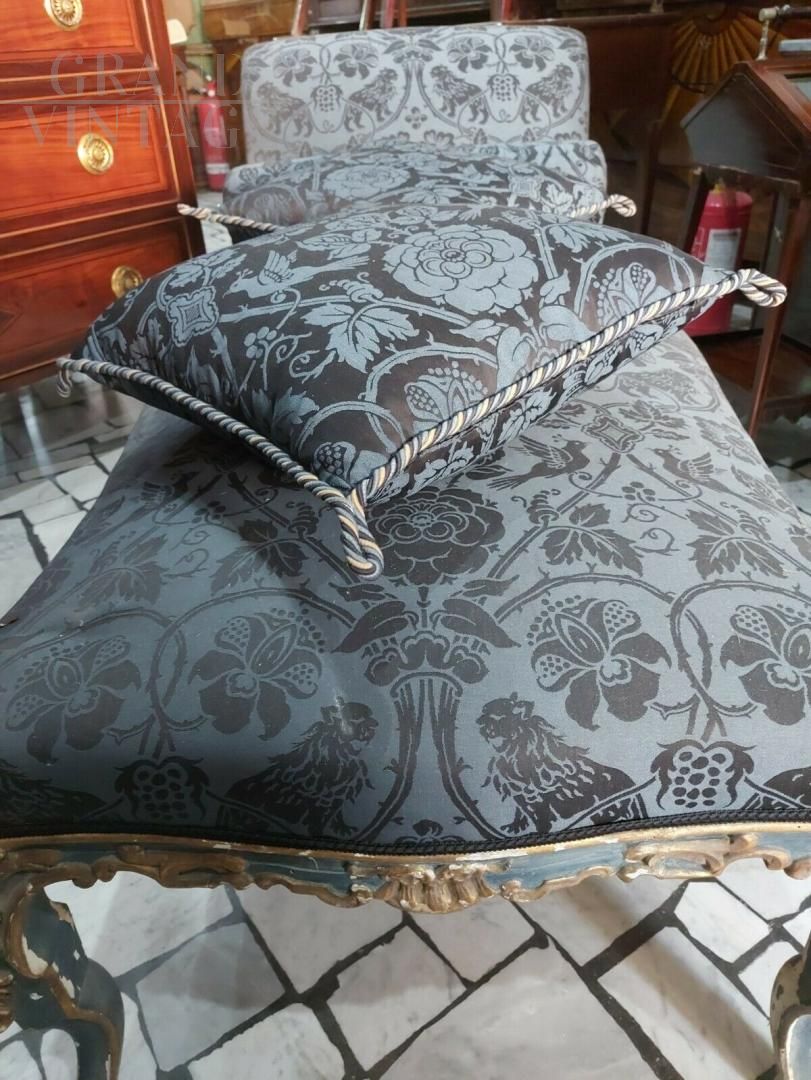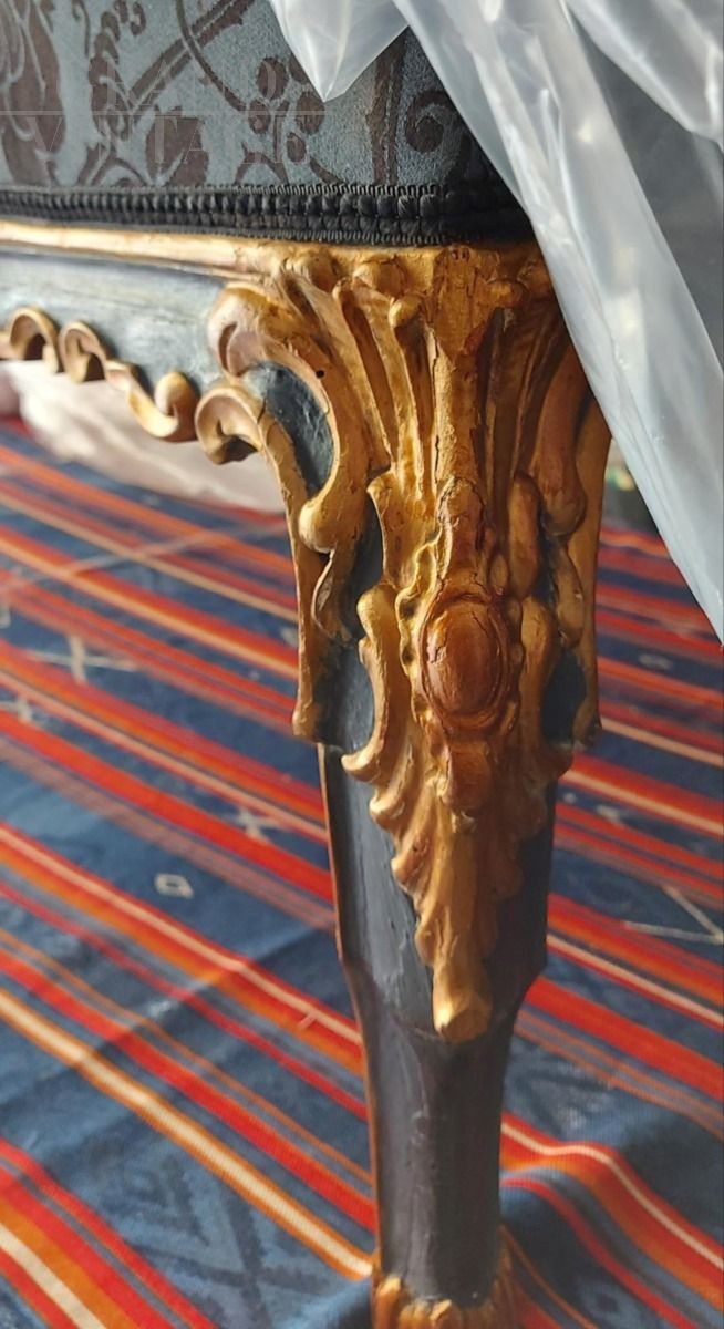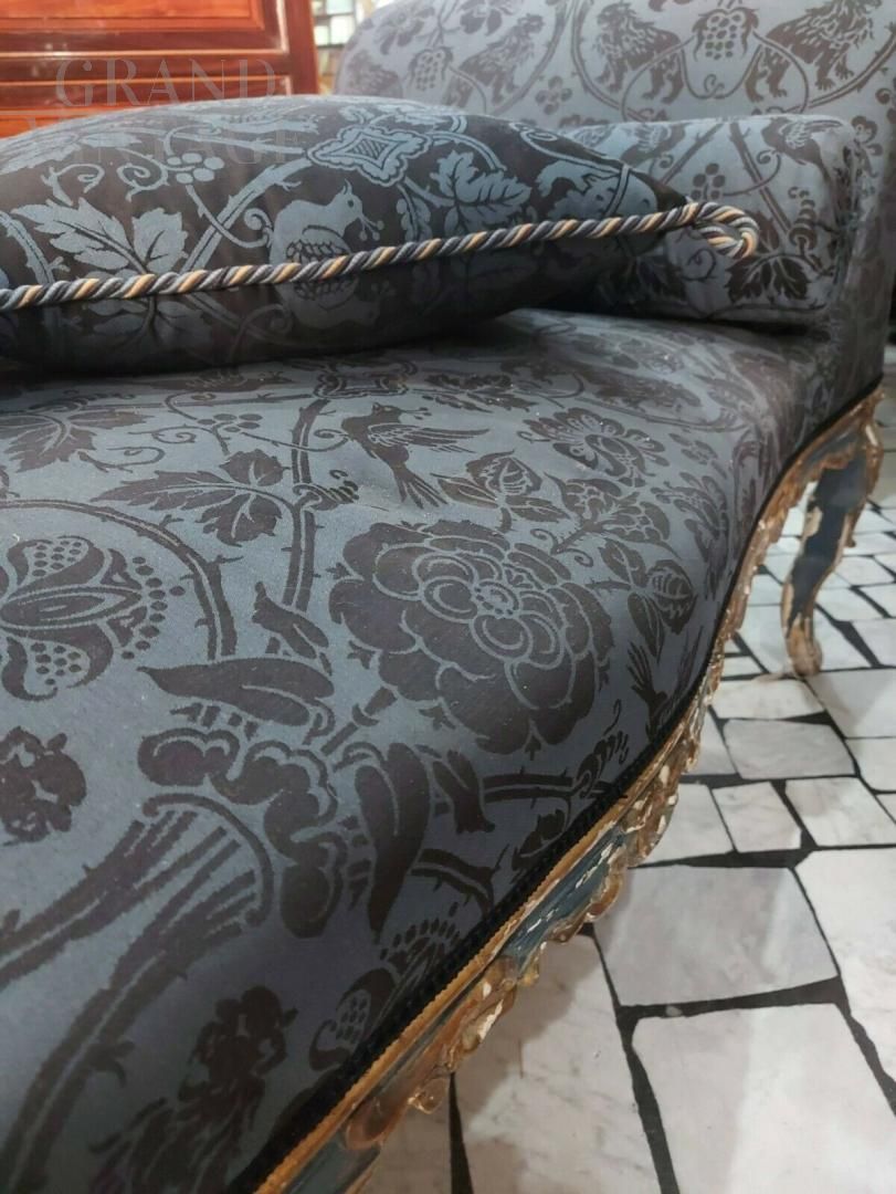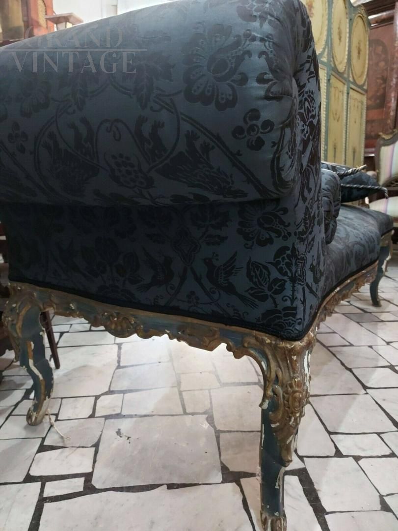 Dormeuse antica di epoca Luigi XIV di chiara influenza francese di inizio '700, in legno intagliato a mano e finemente laccato in blu borbonico e oro argento in mistura, tappezzata in seta San Leucio blu, completa di due cuscini quadrati e uno cilindrico. Provenienza Napoli.
