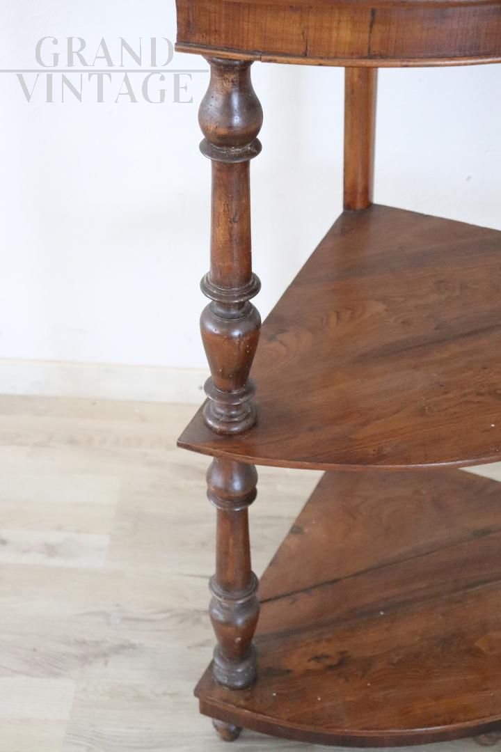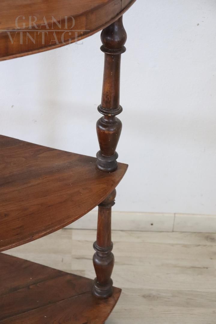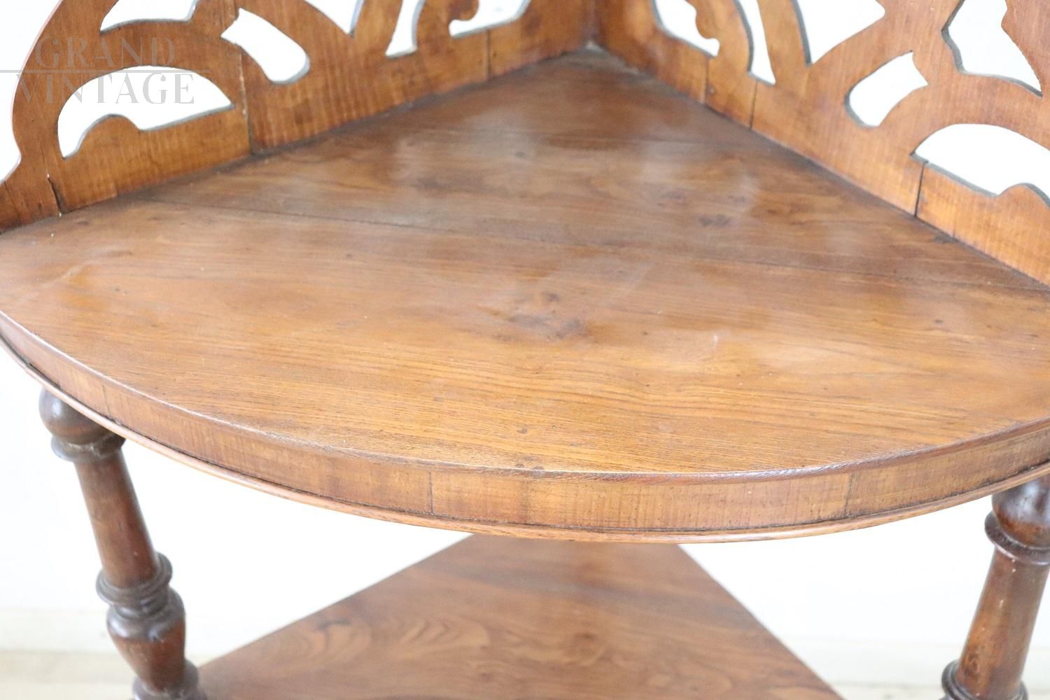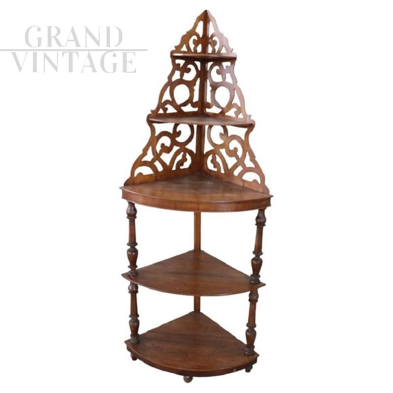 Deliziosa angoliera étagère in noce massello della metà del XIX secolo, caratterizzata da montanti frontali finemente torniti e alzatina lavorata a traforo con riccioli e volute. Dotata di cinque ripiani che diminuiscono di dimensione salendo verso l'alto. Ottime condizioni generali.