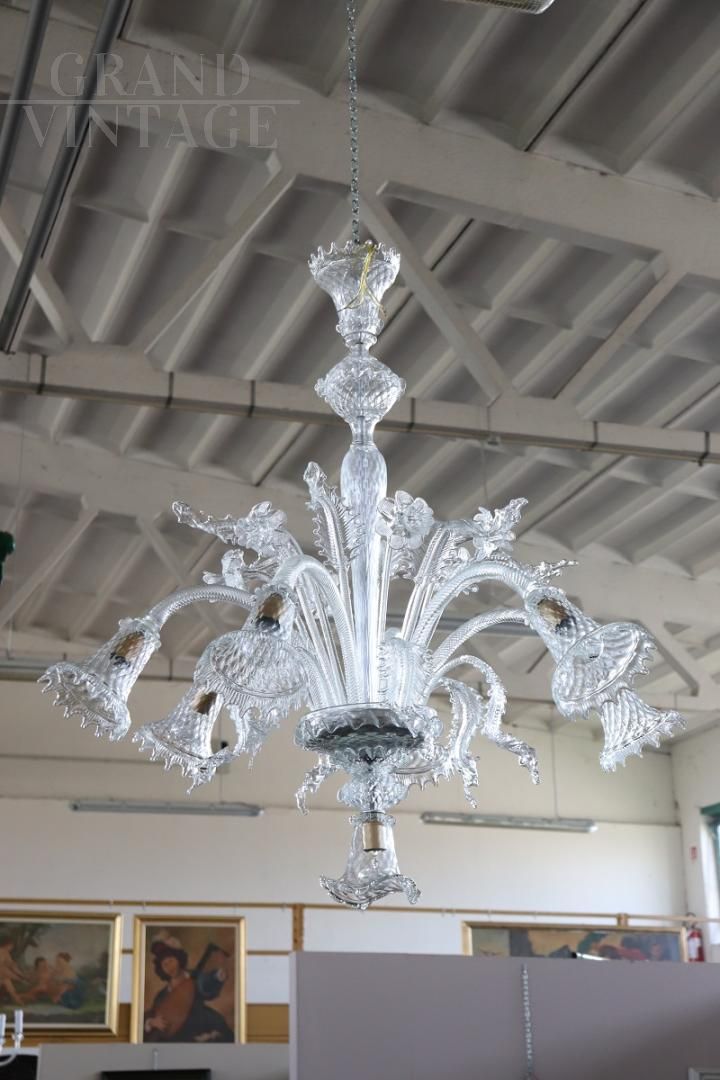 Uno splendido lampadario italiano realizzato in squisito vetro di Murano, risalente agli anni Ottanta.Il lampadario è caratterizzato da un vetro trasparente che incarna leggerezza ed eleganza, ornato da intricate decorazioni floreali e da un delicato fogliame. Piccoli fiori accentuano graziosamente i bracci del lampadario e, quando viene illuminato, la luce mette in risalto ogni elemento decorativo, creando un'atmosfera accattivante. Dotato di sette lampadine, questo lampadario funge da elemento decorativo di grande effetto e da fonte di illuminazione affidabile per qualsiasi ambiente. L'impianto elettrico è stato sapientemente ricablato per garantire un utilizzo sicuro e immediato. Prezzo trattabile.