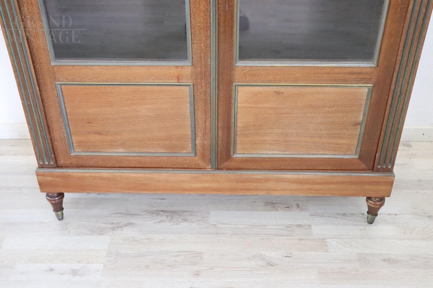 Bellissima elegante vetrina antica primi decenni del secolo XX, molto semplice e lineare. Realizzata in pregiato legno di mogano e caratterizzata da raffinate cornicette dorate che la impreziosicono e illuminano. L’anta è a vetri nella parte alta per esporre i vostri oggetti preziosi mentre una parte bassa rimane cieca. Internamente tre solidi ripiani utili. Grande eleganza, perfetta per esporre i vostri oggetti da collezione, ampio spazio utile interno, l’altezza dei ripiani è modificabile a piacere grazie alla pratica cremagliera interna.