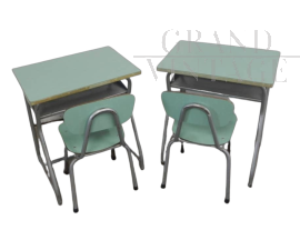 Coppia di banchi scolastici con sedie in formica verde, anni '70