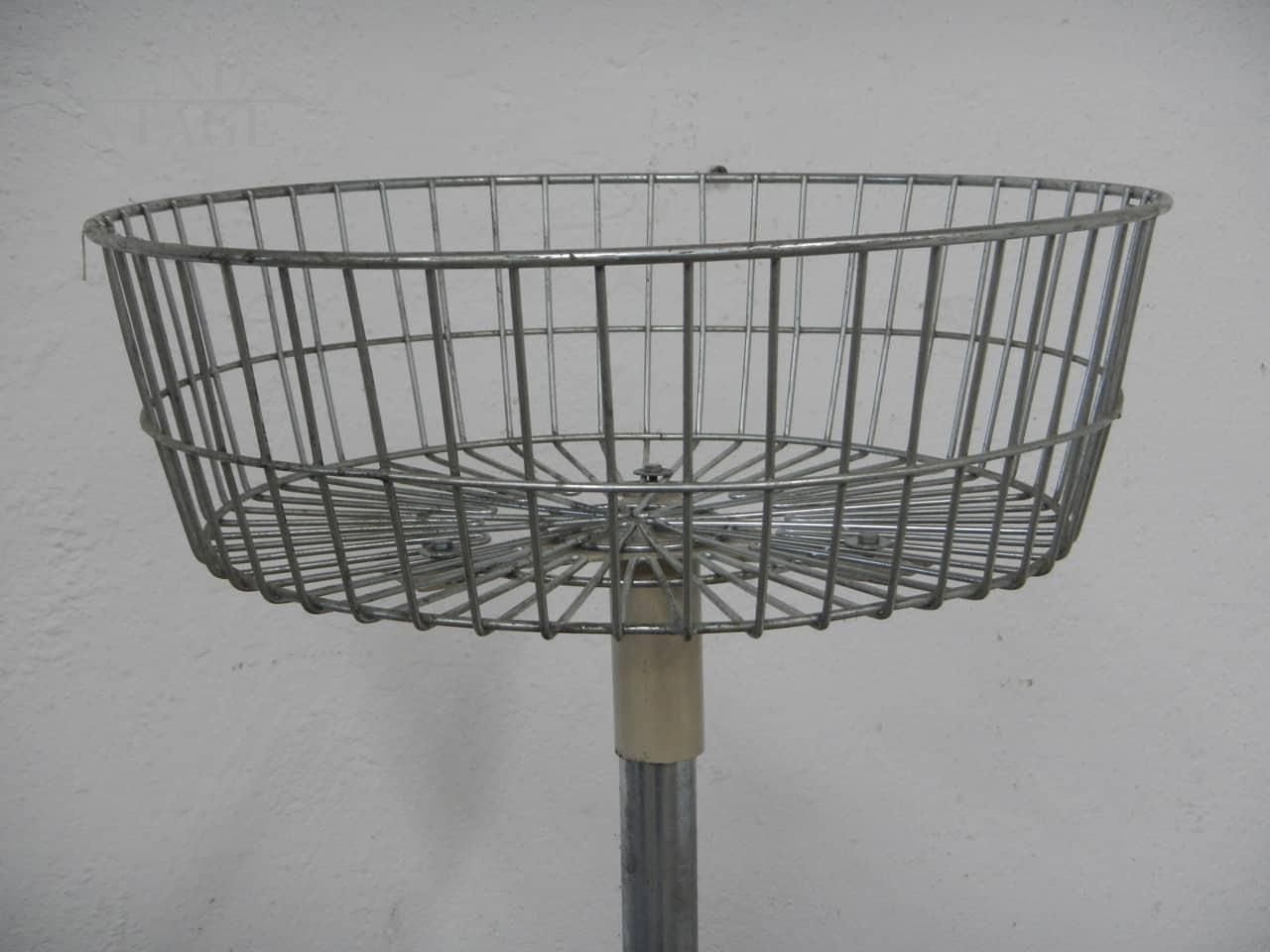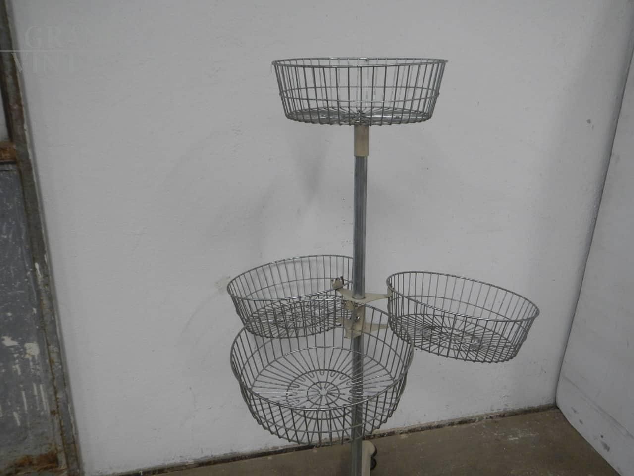 Piccolo carrello espositore da negozio in ferro laccato beige con 4 ceste portaoggetti in rete di ferro con diametro di 36 cm e altezza di 13 cm. In buone condizioni con segni d’uso, in alcune parti lo smalto si è tolto, come da foto. Il carrello è regolabile in altezza ed è dotato di ruote, la cesta superiore si può rimuovere. Prodotto da Zenith Brevetti Sarezzo (Milano) Italia.