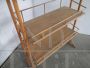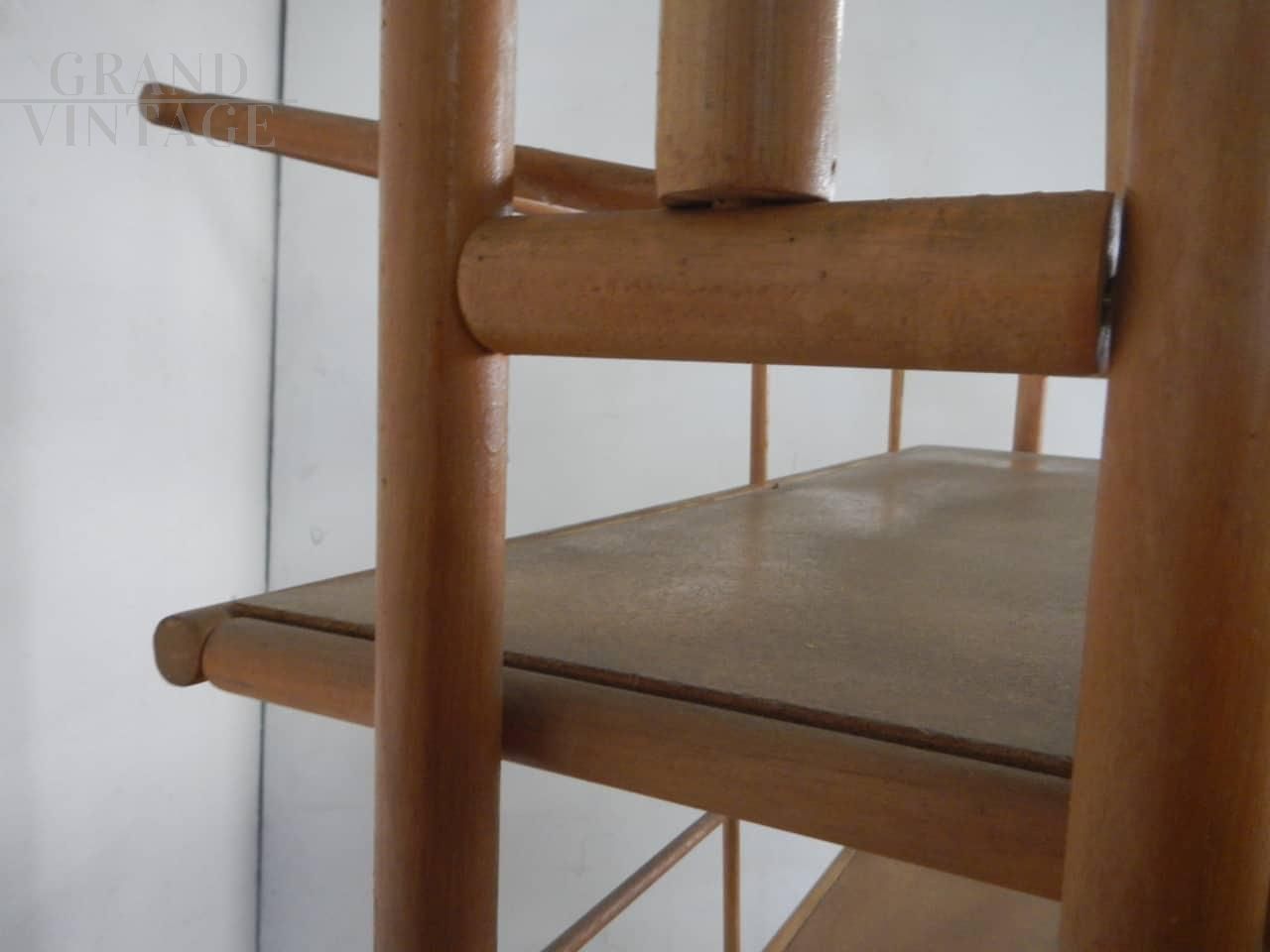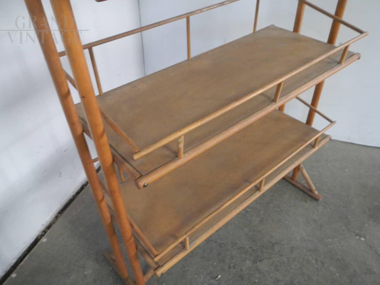 Espositore da negozio prodotto da Salva in bamboo e faesite con insegne pubblicitarie marca Ore Liete in cartone. La distanza fra mensole è di cm 30. In discrete condizioni, con dei difetti e delle riparazioni. L’altezza totale è di cm 198.