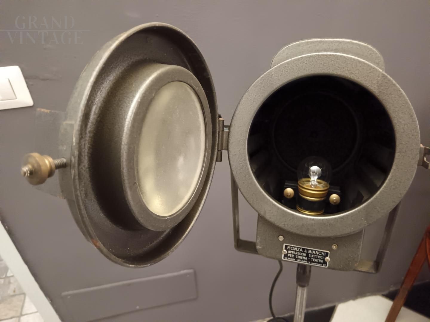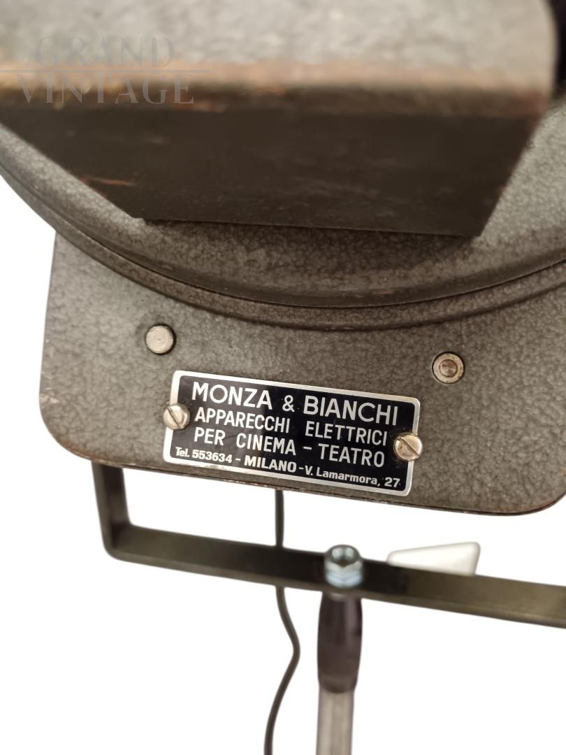 Bellissimo faro cinematografico a piantana funzionante degli anni '50 completo di treppiede, co targhetta del produttore Monza & Bianchi, Milano. In condizioni eccellenti in ogni sua parte e funzionante, perfetto per illuminare un angolo o un'opera d'arte.