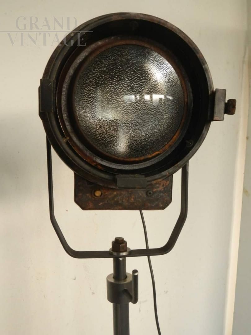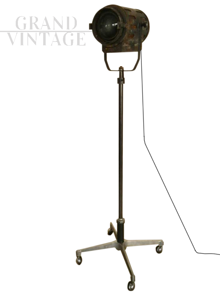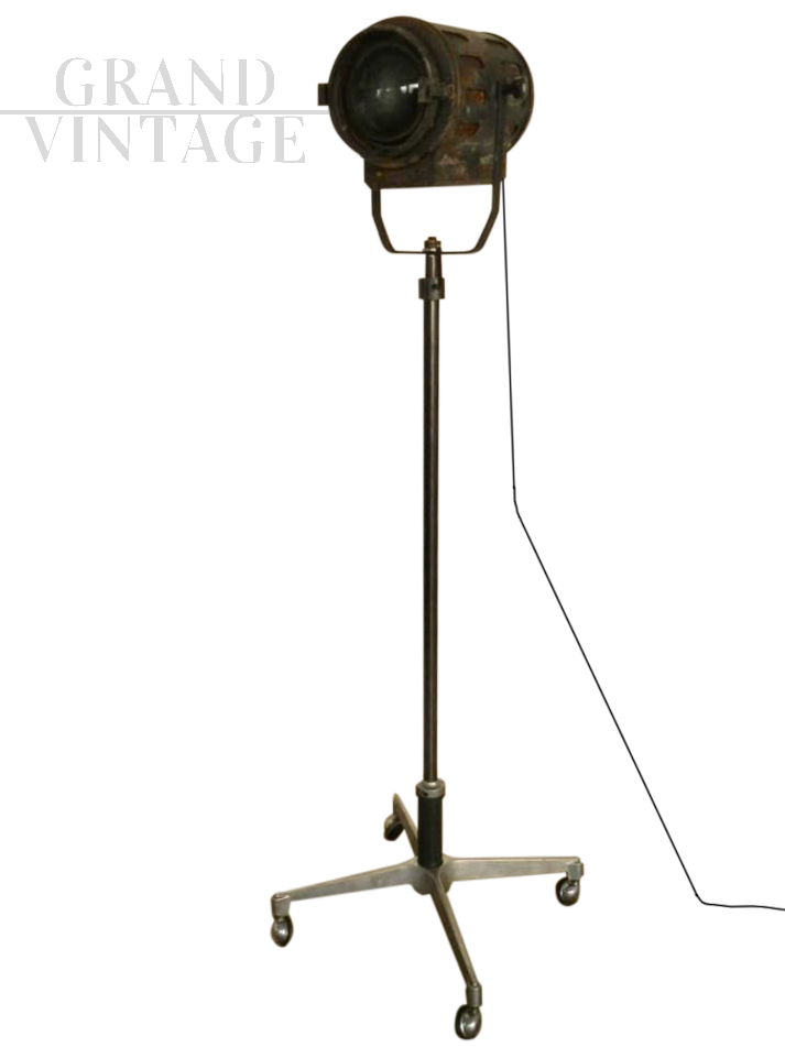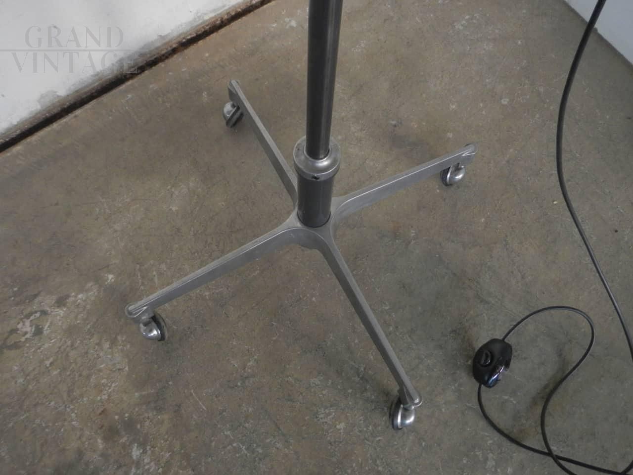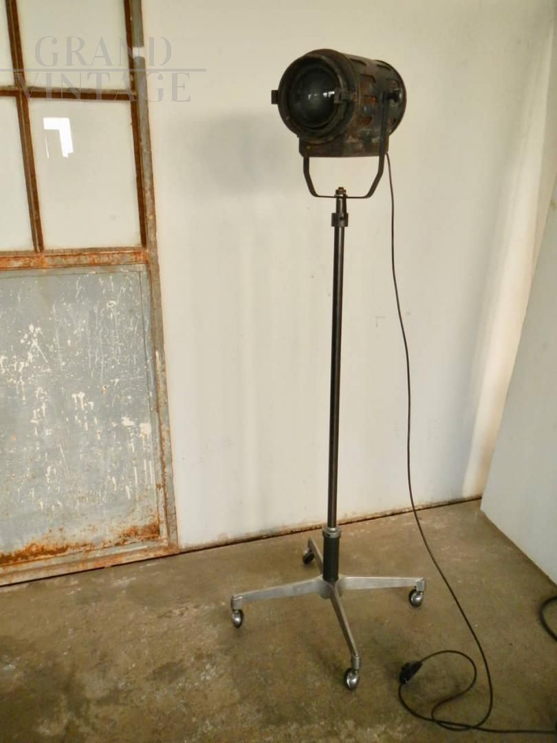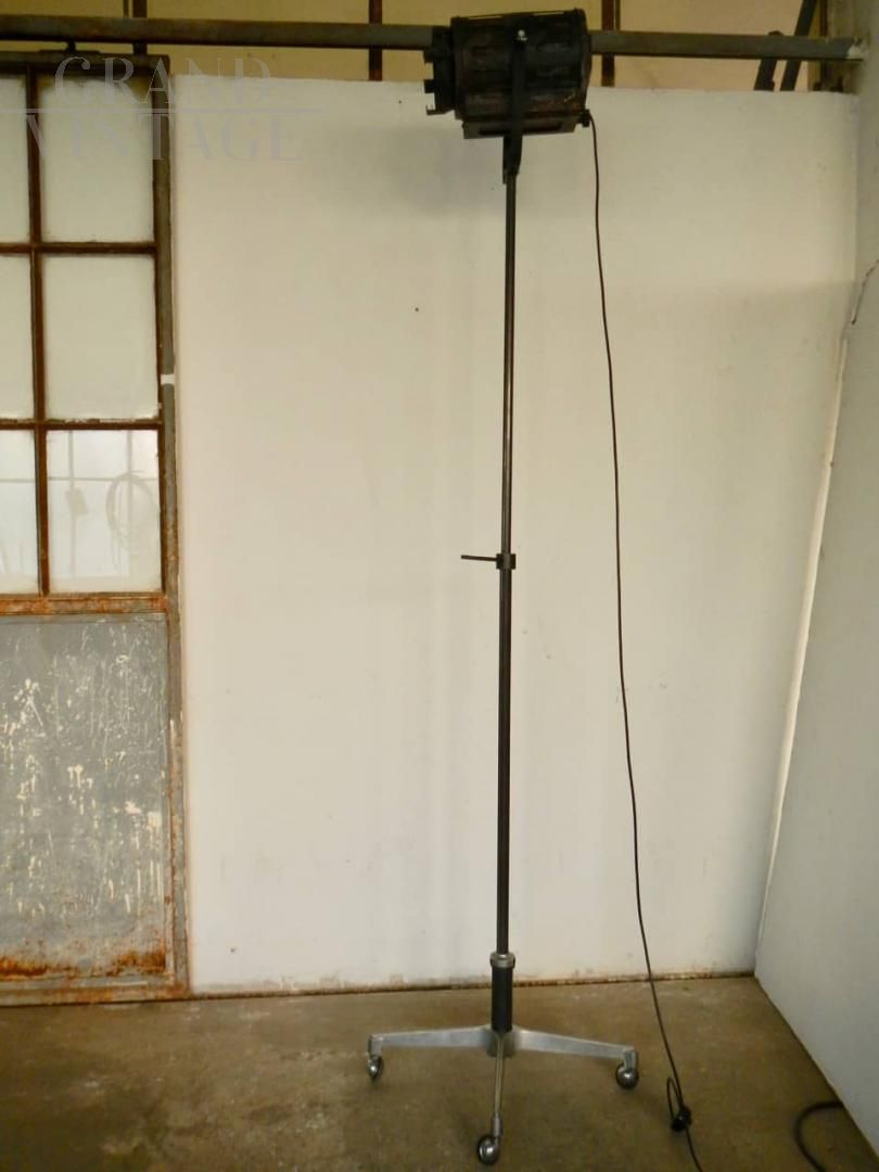 Faro da palco anni '60 funzionante con attacco E27, con suppurto regolabile in altezzza da cm 155 a cm 240, con base in alluminio dotata di ruote.