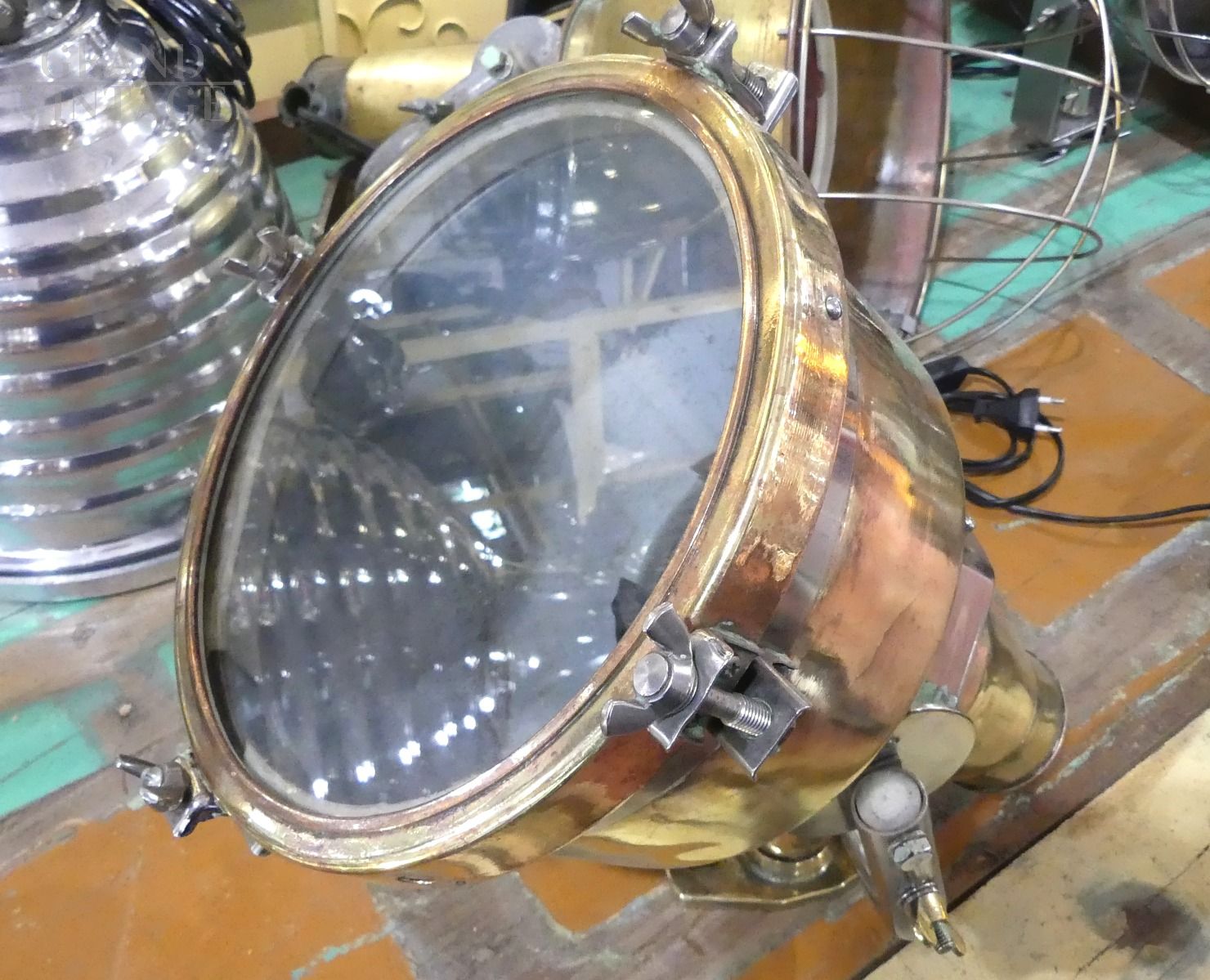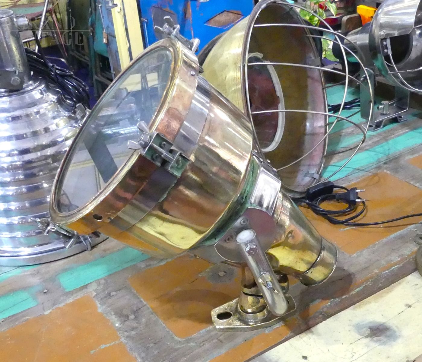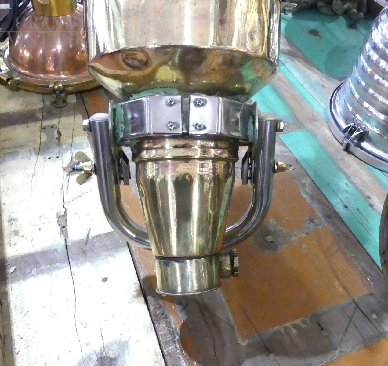 Lampada faro industriale vintage in acciaio e ottone, utilizzato su navi mercantili.