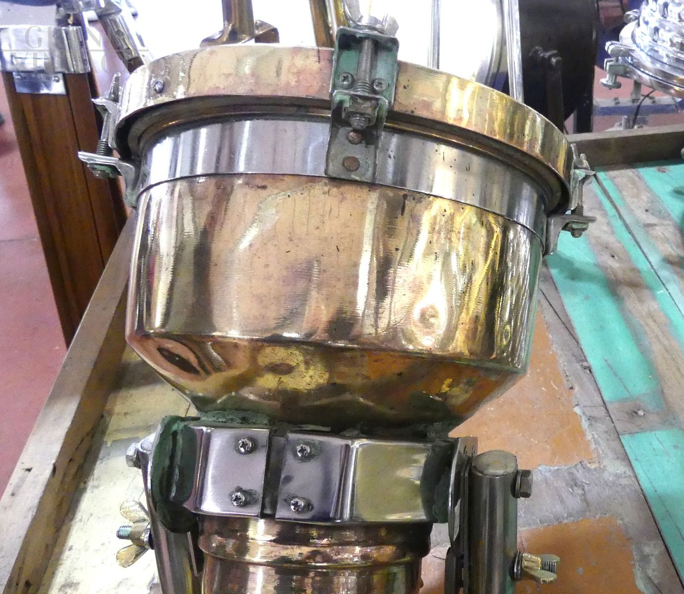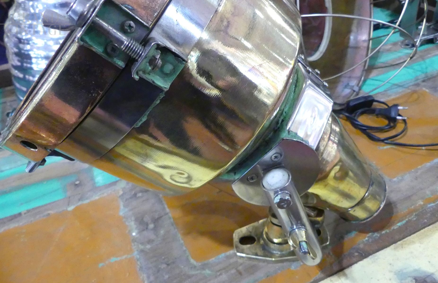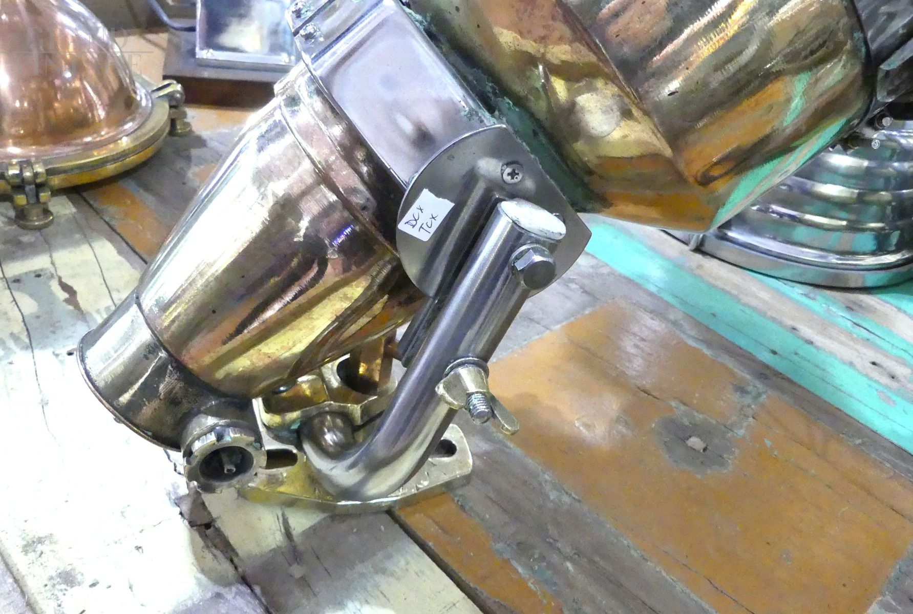 Lampada faro industriale vintage in acciaio e ottone, utilizzato su navi mercantili.