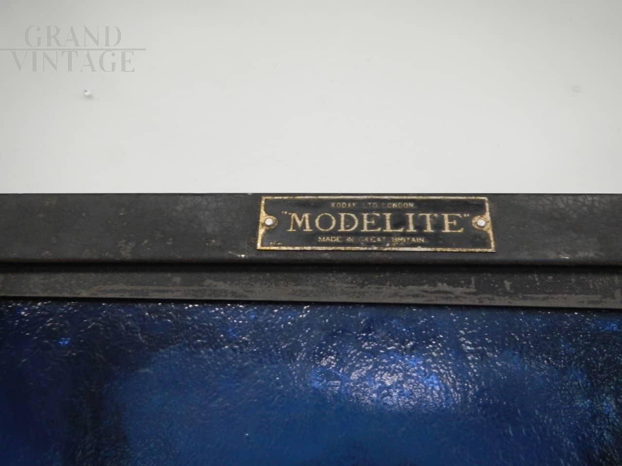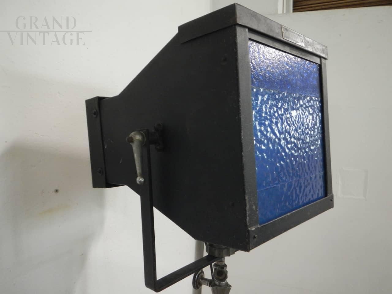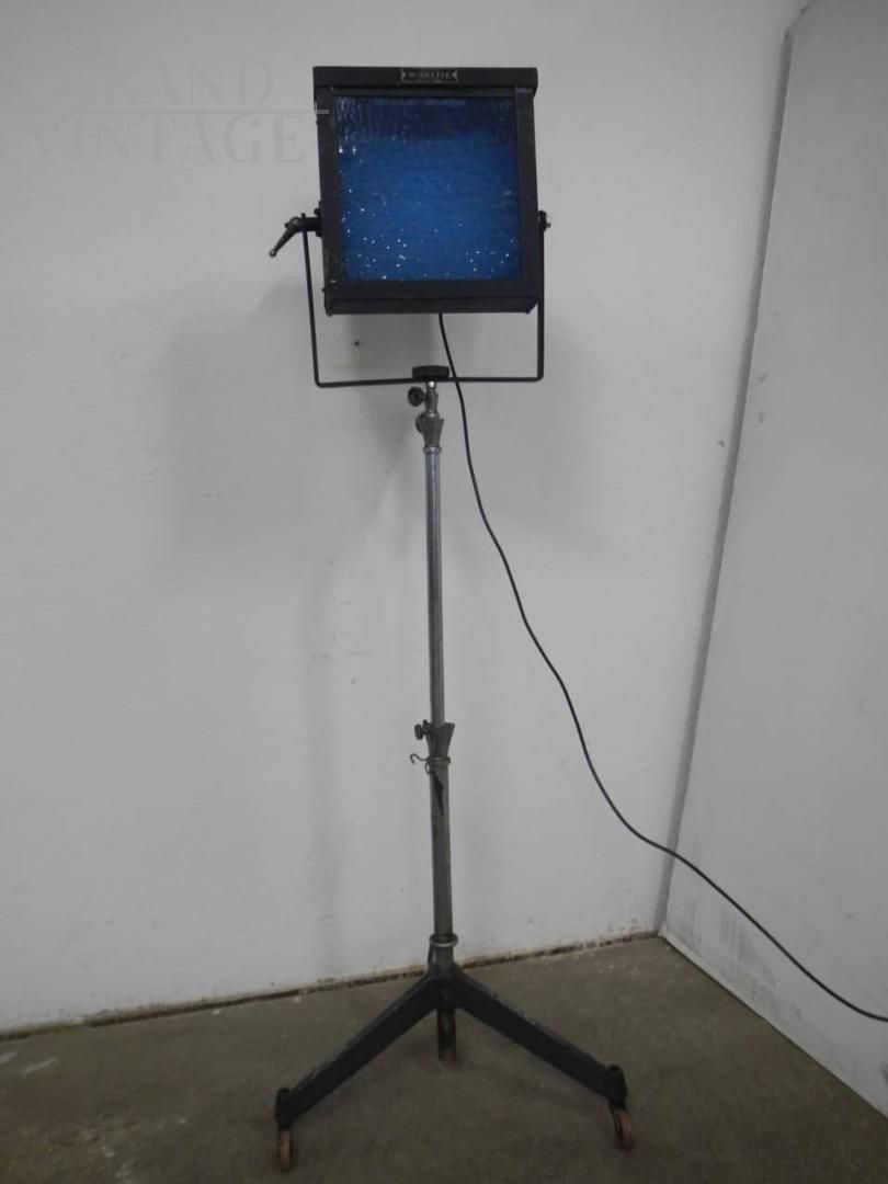 Faro Modelite prodotto da Kodak LTD London anni '30 con vetro blu, struttura in metallo laccato nero e base in metallo con ruote, regolabile in 3 altezze: 120, 160 o 200 cm. Cavalletto smontabile. In buone condizioni.