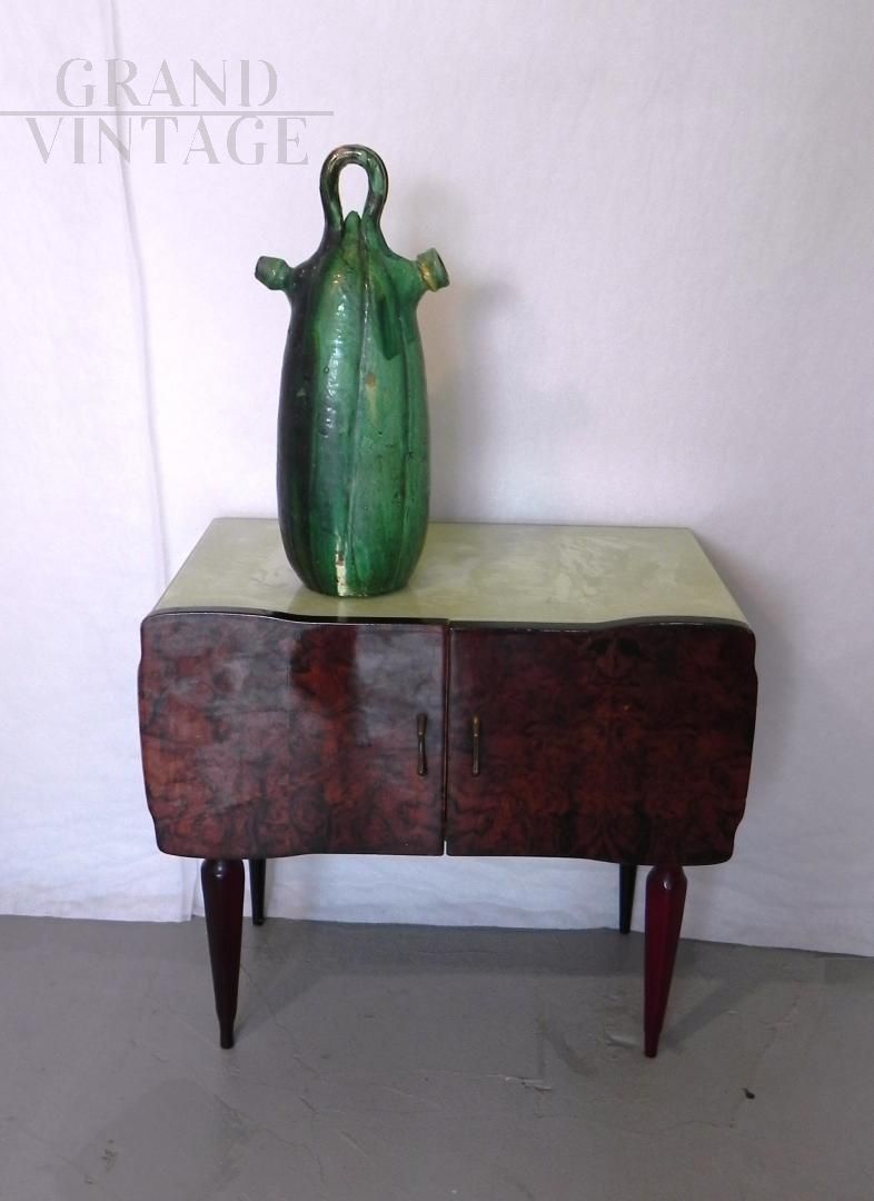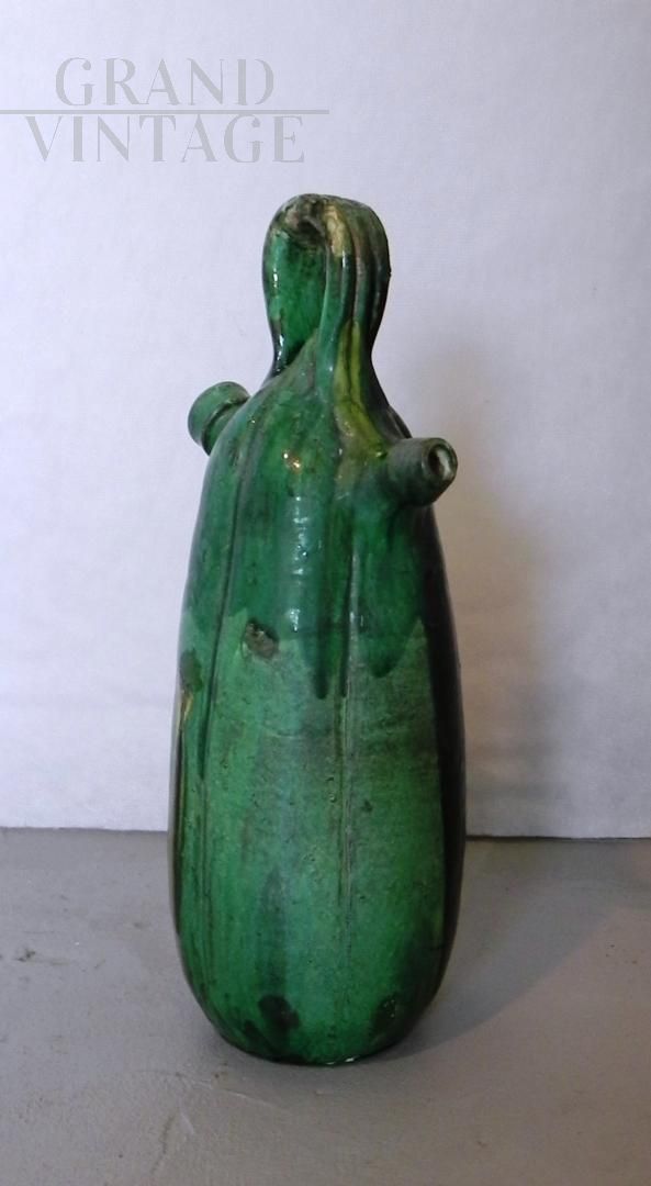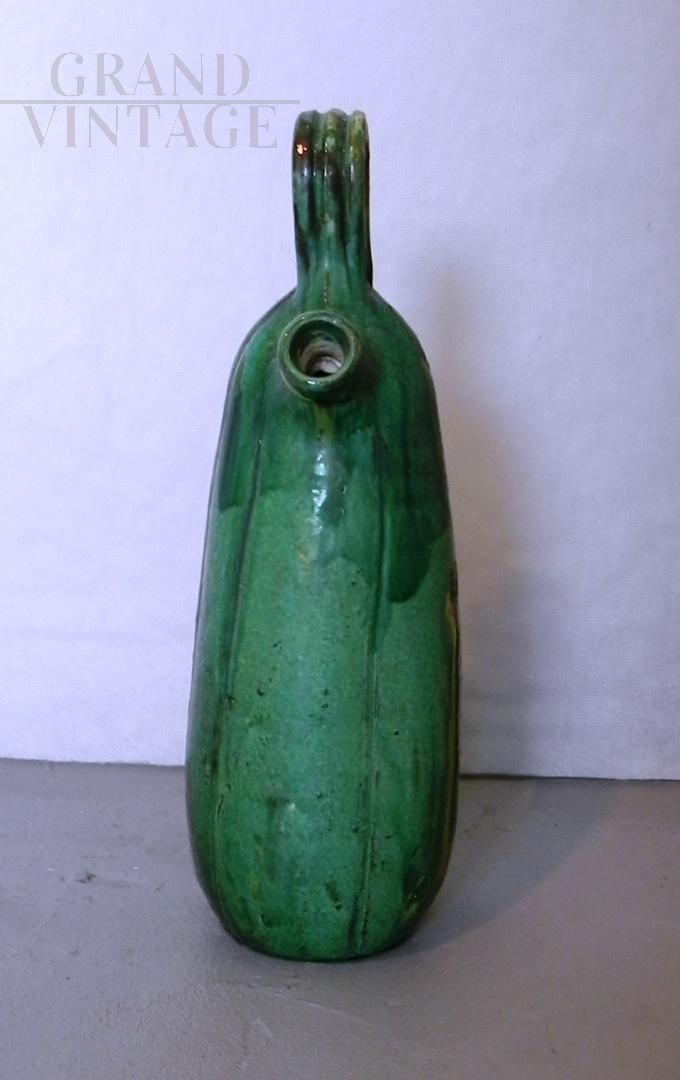 Fiaschetta botijo cantir catalana in terracotta smaltata verde, anni '70