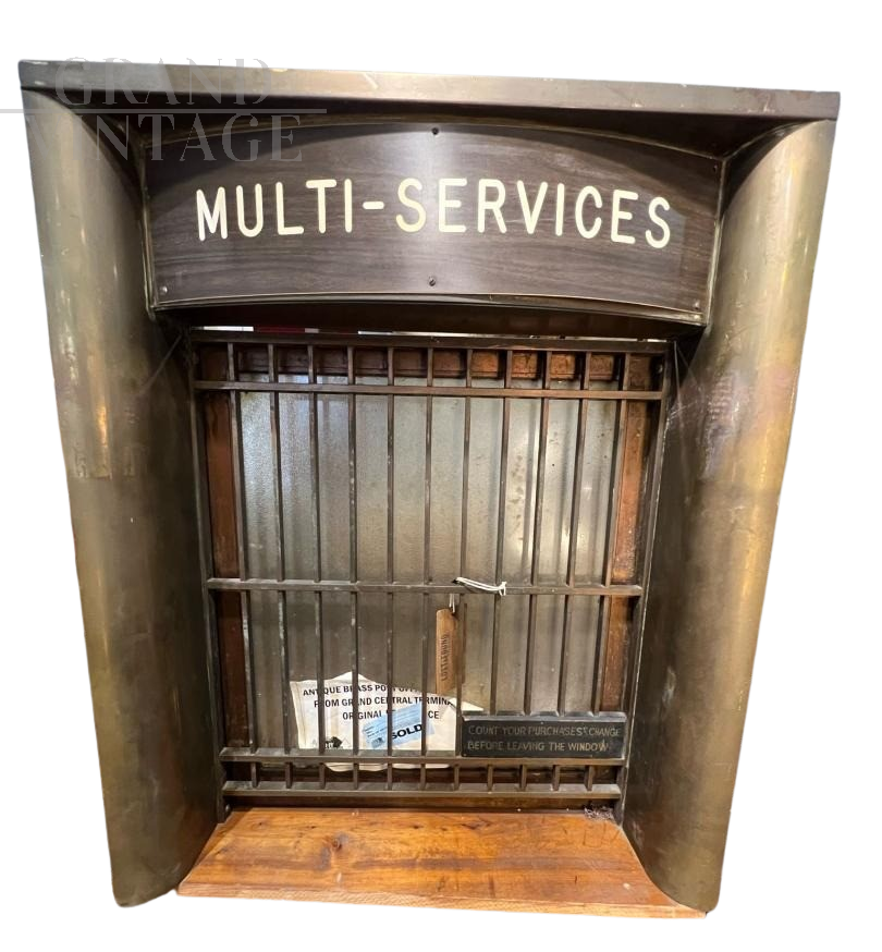 Vecchia finestra di servizio da biglietteria vintage proveniente dalla Stazione Centrale di New York - Grand Central Terminal. Realizzata in ottone e legno, conserva ancora la targa che recita "controllare acquisti e resti prima di allontanarsi dallo sportello". L'oggetto è originale e ben conservato nella sua patina.